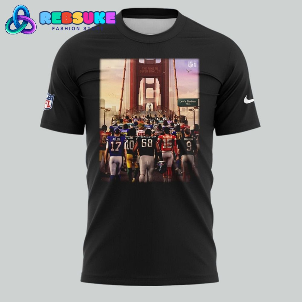 The design of the 2025 NFL The Road To Super Bowl LX Special Shirt is a masterful blend of iconic imagery and fan-centric detailing, making it a truly unique piece. The central graphic boldly depicts a multitude of NFL players, each wearing their respective team jerseys, as they collectively march towards the Golden Gate Bridge. This powerful visual metaphor perfectly encapsulates “The Road To Super Bowl LX,” symbolizing the arduous journey and unified aspiration of every team vying for the ultimate prize. The prominent display of “THE ROAD TO SUPER BOWL LX” text above the bridge further emphasizes the shirt’s theme, drawing the eye and solidifying its commemorative purpose for the 2025 NFL Super Bowl.