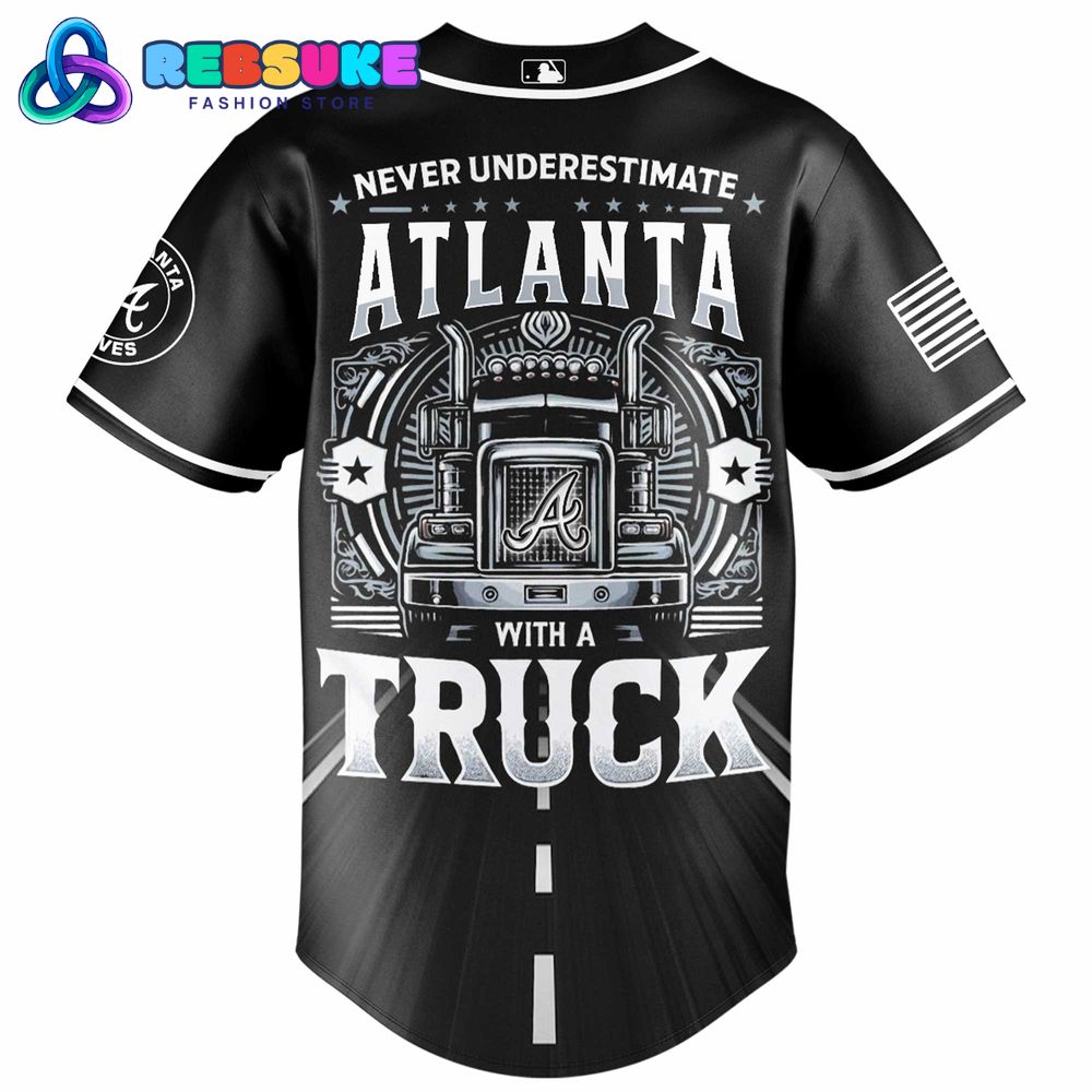 On the back, the Atlanta Braves MLB x Truck Driver Appreciation Week Jersey delivers a powerful message with the phrase “Never Underestimate Atlanta with a Truck” in bold white text. Below, an intricately designed semi-truck features the Braves logo on its cab, surrounded by detailed artwork that captures the essence of the open road. A small MLB logo at the collar and a Truck Driver Appreciation Week patch on the sleeve add authenticity, making this jersey a true collector’s item for those who admire both the Atlanta Braves and the trucking profession.