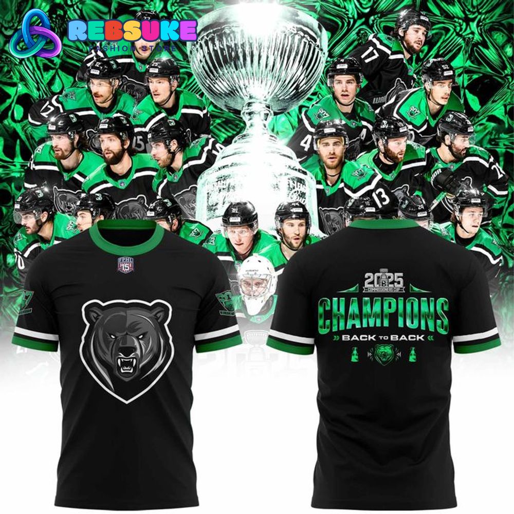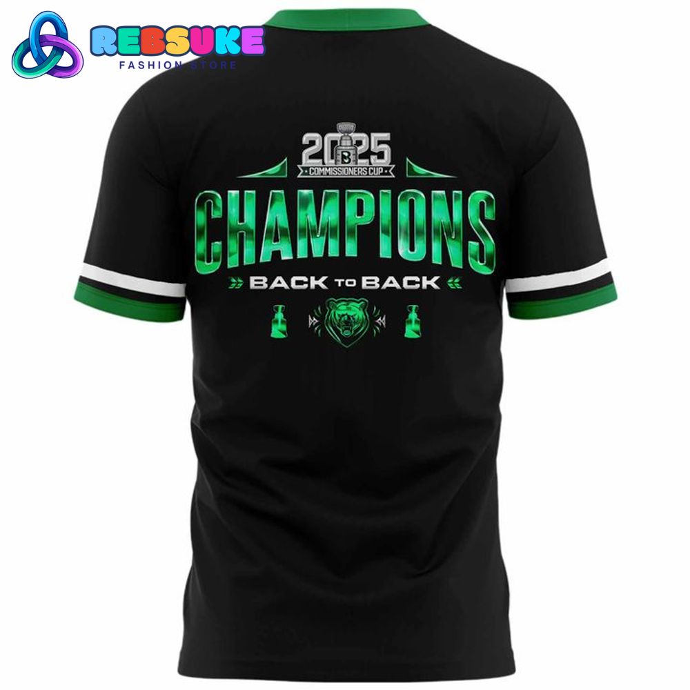 On the back, the Binghamton Black Bears 2025 Commissioner’s Cup Champions Shirt proudly declares the team’s success with the text “2025 Champions” in large, vibrant green letters, emphasizing their Commissioner’s Cup victory. Below, the phrase “Back to Back” is flanked by two small bear logos, highlighting the Binghamton Black Bears’ consecutive wins in the 2025 Commissioner’s Cup. The design captures the energy of the Black Bears’ championship run, making this shirt a standout piece for fans eager to celebrate the 2025 Commissioner’s Cup triumph.