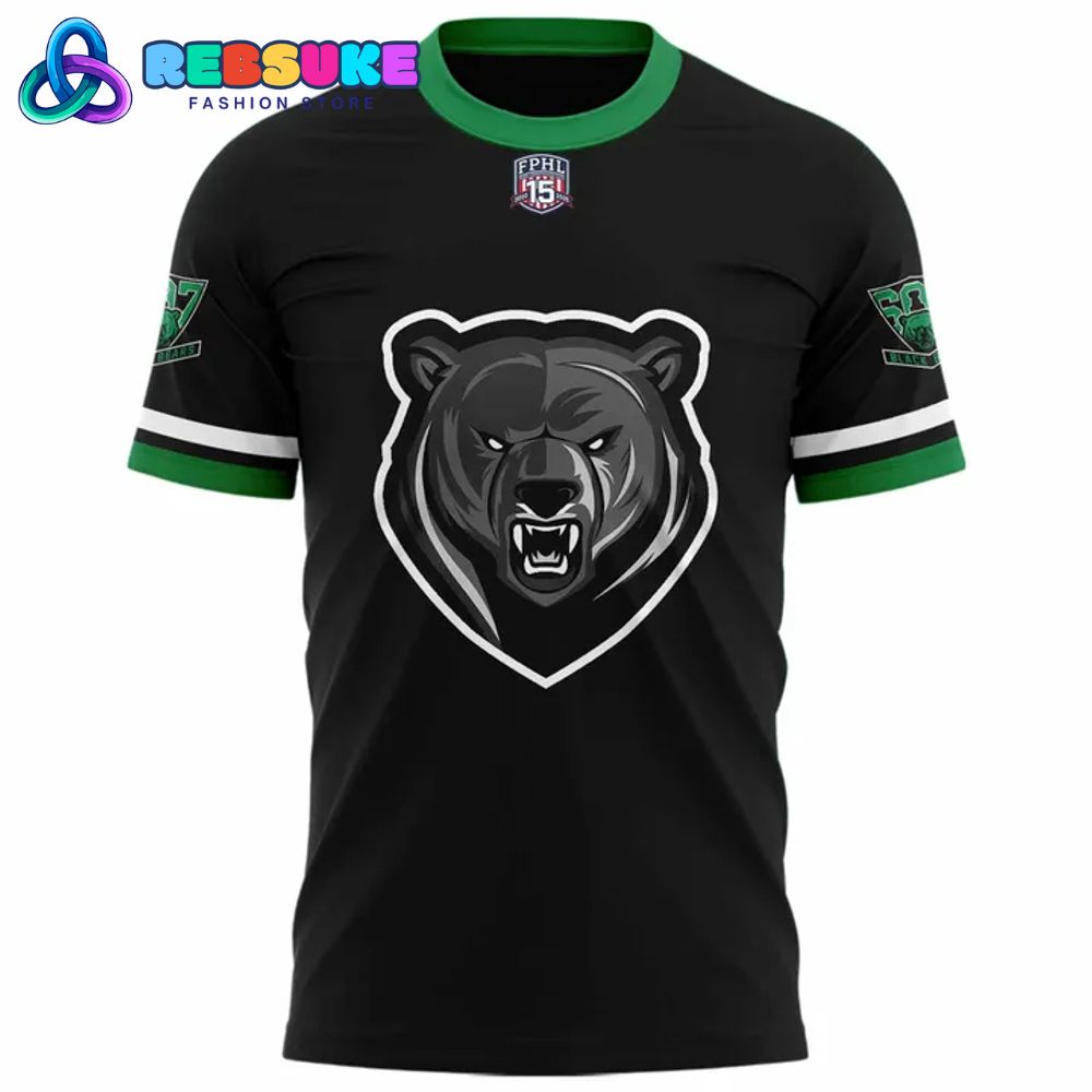 The Binghamton Black Bears 2025 Commissioner’s Cup Champions Shirt features a bold and dynamic design that reflects the Binghamton Black Bears’ dominance in the 2025 Commissioner’s Cup. The front showcases a fierce bear head logo in black and white, symbolizing the strength and tenacity of the Black Bears during the Commissioner’s Cup. The black base of the shirt is accented with green and white stripes on the sleeves and collar, tying into the team’s iconic colors and creating a striking look for the 2025 Commissioner’s Cup celebration.