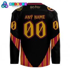 The back of the Birmingham Bulls x Harry Potter Night 2025 Hockey Jersey is equally captivating, featuring an even more intricate design. At the top, the iconic Harry Potter logo is emblazoned in its signature font, immediately transporting you to the wizarding world. Below this, a space is provided for “ANY NAME,” allowing you to personalize the jersey with your own or a favorite character’s name, along with a large, customizable number in the middle. The color scheme of black, maroon, and yellow stripes continues down the back and sleeves, providing a cohesive and stylish look that perfectly blends the team’s colors with those of the Hogwarts houses.