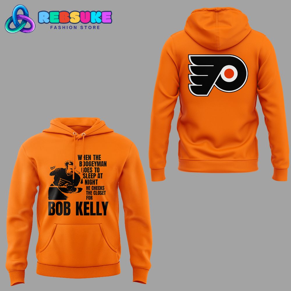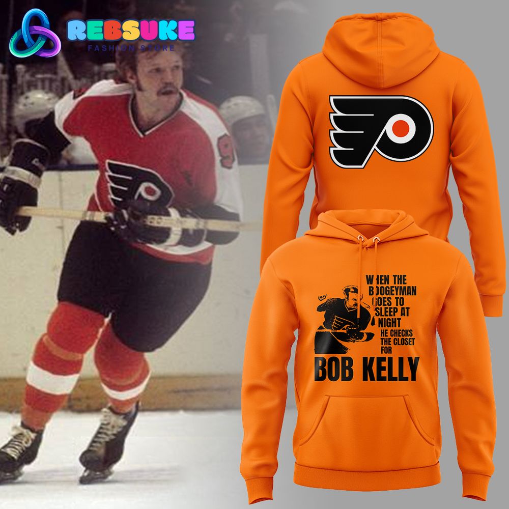 The design of the Bob Kelly Philadelphia Flyers Limited Edition Hoodie Set is a creative and humorous nod to the player’s tough-guy reputation. The central graphic on the front of the hoodie features a stylized image of Bob Kelly himself in his classic orange and black jersey, embodying the “Broad Street Bullies” spirit. Adjacent to this image is the famous quote, “WHEN THE BOOGEYMAN GOES TO SLEEP AT NIGHT HE CHECKS THE CLOSET FOR BOB KELLY.” This legendary saying captures the fear that opponents had of him and his hard-hitting style of play. This unique graphic makes the hoodie a standout piece that is instantly recognizable to fans.