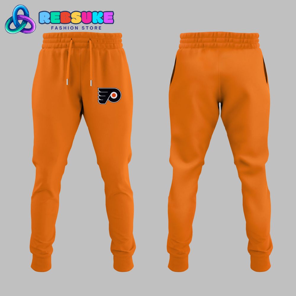 The accompanying joggers in the Bob Kelly Philadelphia Flyers Limited Edition Hoodie Set continue the minimalist and stylish aesthetic. The joggers are a solid orange color, perfectly matching the hoodie and providing a sleek, unified look. The Philadelphia Flyers logo is featured discreetly on one leg, providing a subtle yet powerful statement of support. This simple and clean design allows the focus to remain on the hoodie’s bold statement piece while still maintaining a cohesive outfit. The joggers offer a comfortable fit and a stylish appearance, making them suitable for both athletic activities and casual wear.