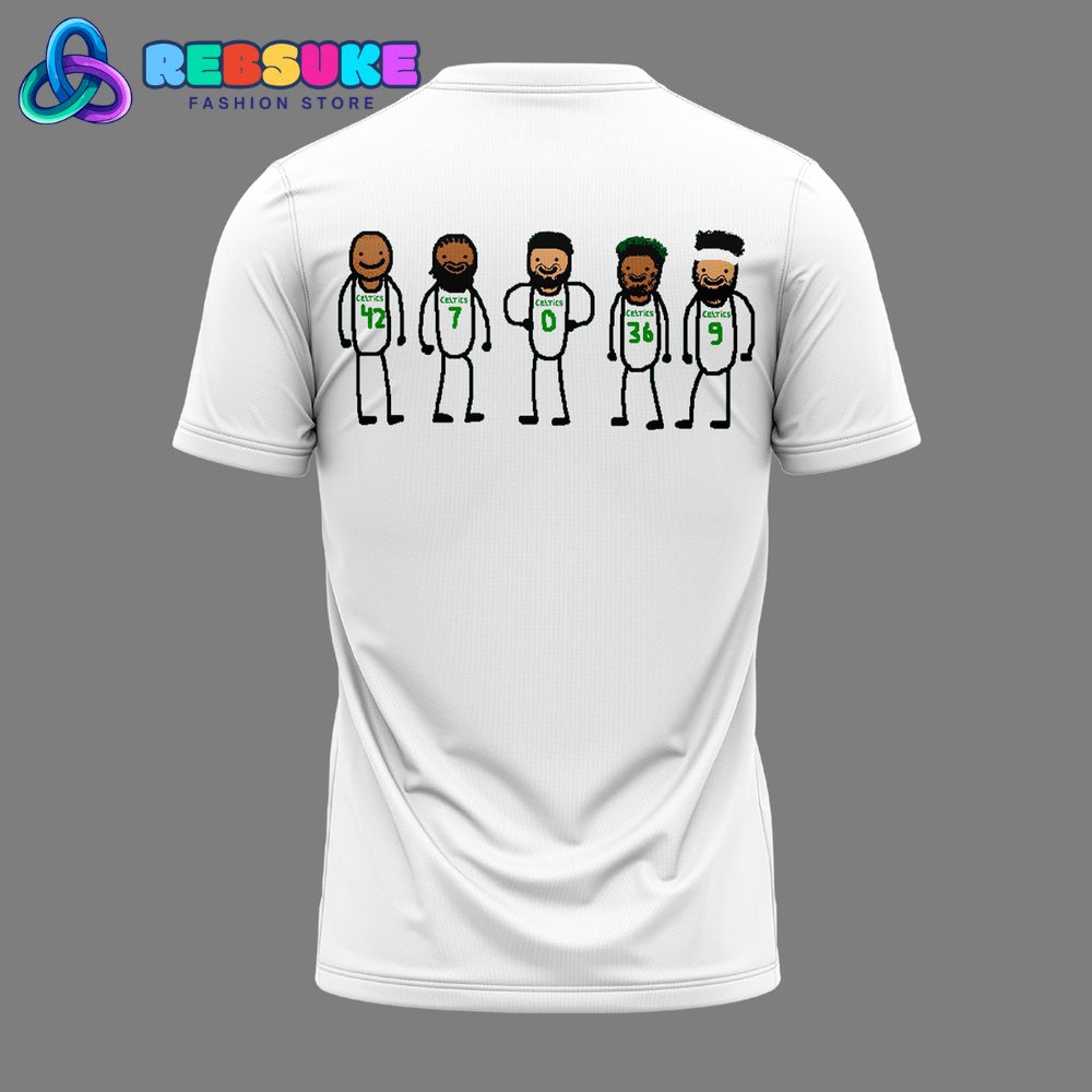 Flipping the Boston Celtics New Design Logo 2025 Limited Edition Shirt over reveals an equally compelling design on the back. The rear graphic features five stylized, hand-drawn caricatures of what appear to be key players from the team. Each figure is uniquely depicted, with distinct hairstyles and facial hair, adding a personalized touch. The attention to detail is evident in the inclusion of a jersey number on some of the characters, such as the numbers “42,” “7,” and “0.” These drawings are a fun and artistic way to pay homage to the star players of the Boston Celtics, making this shirt a true collector’s item for fans who appreciate both the team’s history and its current roster. This dual-sided graphic elevates the Boston Celtics New Design Logo 2025 Limited Edition Shirt beyond a simple piece of apparel.