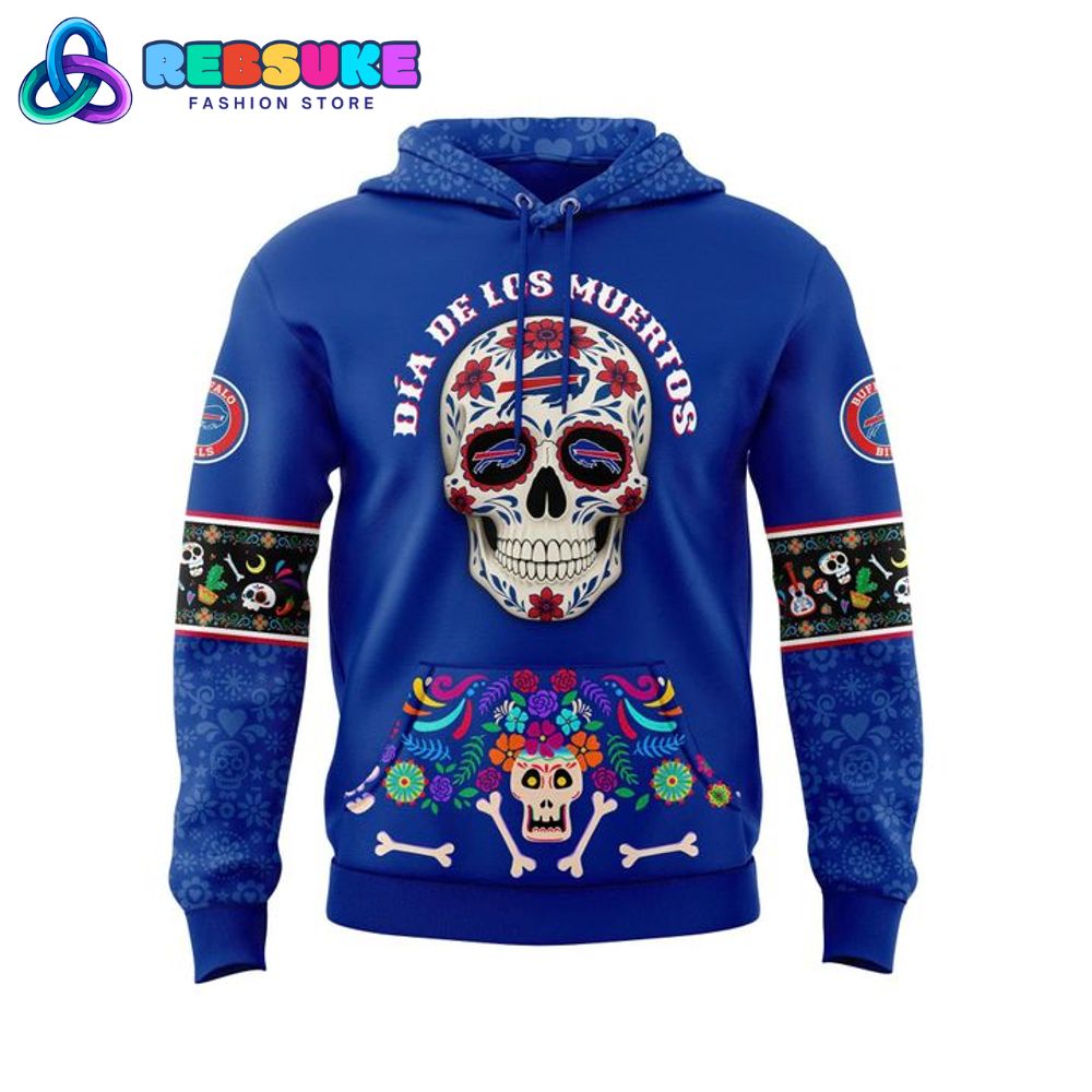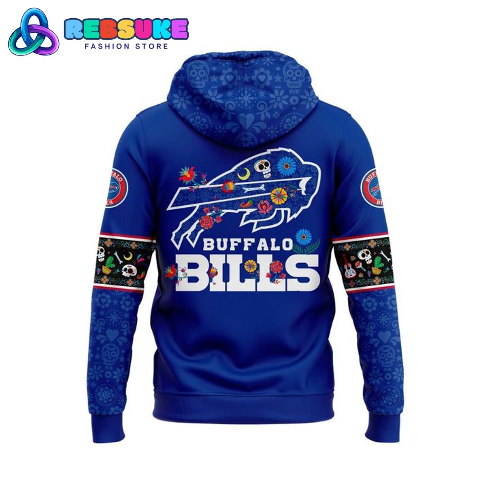 The reverse side of the Buffalo Bills “Dia De Los Muertos” Limited Edition Hoodie 2025 features a prominent graphic that seamlessly merges the team logo with the cultural theme. The iconic Buffalo Bills charging buffalo logo is outlined in white, and its interior is filled with a lively array of Día de los Muertos motifs, including smaller skulls, flowers, and even miniature football-shaped elements. This intricate design, set against the bold blue of the hoodie, makes a strong visual impact. Below the graphic, the wordmark “BUFFALO BILLS” is proudly displayed in large, recognizable block letters, ensuring team identity is clearly visible. The overall composition on the back emphasizes the enduring, vibrant spirit of the Bills team, celebrating them with the respectful flair of the holiday.