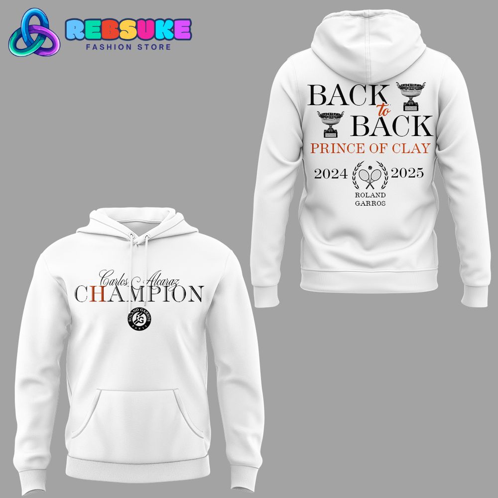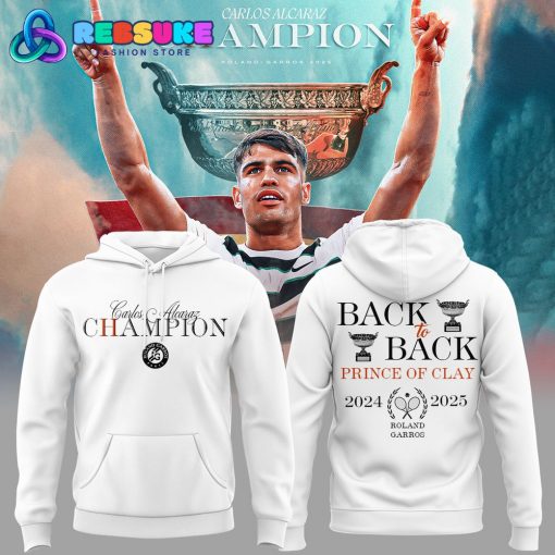 Turning to the back, the Carlos Alcaraz Back To Back Champions Roland Garros 2025 Hoodie Set reveals the core message of this commemorative piece: “BACK TO BACK.” This powerful phrase is boldly printed, emphasized by two stylized trophy icons, representing consecutive victories. Below this, the esteemed title “PRINCE OF CLAY” further highlights Carlos Alcaraz‘s dominance on the red dirt, a surface where he excels. The years “2024” and “2025” are prominently displayed, likely flanking a tennis racket and ball graphic, signifying the potential two-year championship streak at Roland Garros. This detailed back design tells the story of Alcaraz’s incredible journey and potential legacy, making the hoodie a narrative piece of fan apparel that truly resonates with tennis history.