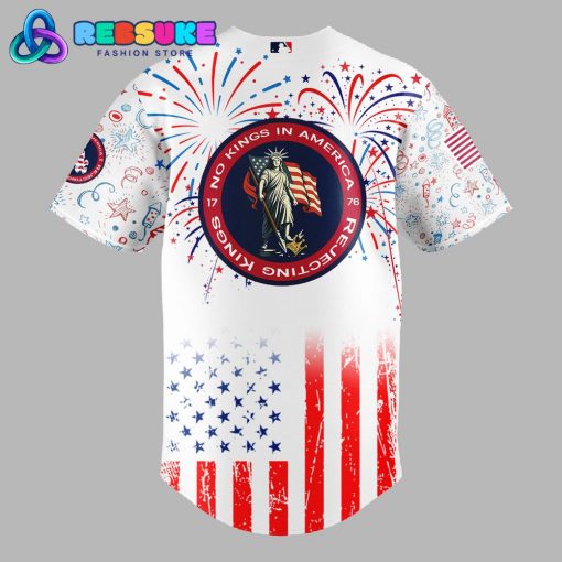 The thematic climax of the jersey is found on its back, centered on a powerful and symbolic medallion. This emblem boldly carries the message “Rejecting Kings” and “No Kings In America,” encircling a detailed image of the Statue of Liberty. The historically significant dates “17” and “76” provide a definitive historical anchor to the design. This rear emblem on the No Kings Jersey provides a stunning narrative conclusion, making the entire patriotic baseball jersey a complete and profound statement of freedom and team pride.