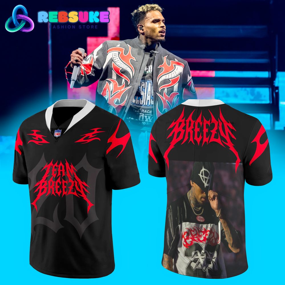 The Chris Brown Breezy Bowl XX Playmaker Football Jersey features a striking design that is both bold and intricate. The front of the jersey is dominated by the phrase “TEAM BREEZY” in a stylized, jagged font that mimics a rock or metal band logo. This gives the jersey an edgy, powerful feel that is perfectly aligned with Chris Brown’s high-energy performances. The lettering is set against a backdrop of flowing, wing-like patterns in shades of dark gray and black, creating a sense of motion and intensity. The iconic Chris Brown logo, a stylized ‘CB’ within a circle, is discreetly placed on the chest, further cementing its authenticity. The color palette of black, red, and white is a classic combination that exudes confidence and style, making the Breezy Bowl XX Playmaker Football Jersey a visually stunning piece.