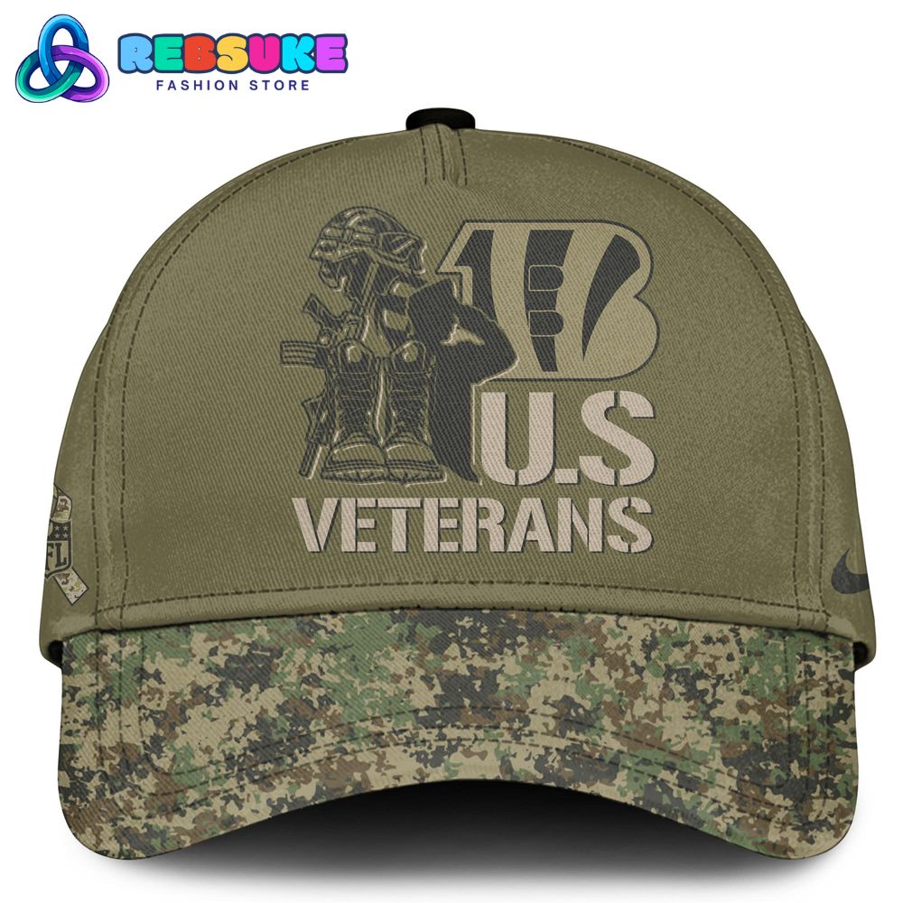 The design of the Cincinnati Bengals x U.S Veteran Day Night Game 2025 Hoodie Set is a masterpiece of symbolic art, blending military aesthetics with team iconography. The hoodie features a large, striking graphic on the back, showcasing the Cincinnati Bengals logo alongside a silhouette of a soldier in full gear, all set against a camouflage background. The phrase “U.S VETERANS” is prominently displayed in a distressed, stylized font, giving the garment a rugged, authentic feel. On the front, a custom name and the team’s location are integrated into the design, personalizing the tribute. The sleeves of the hoodie also feature a camo pattern, while the main body maintains a solid military green, creating a balanced and visually appealing look that perfectly captures the essence of the 2025 U.S Veteran Day Night Game.