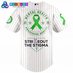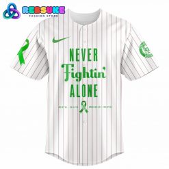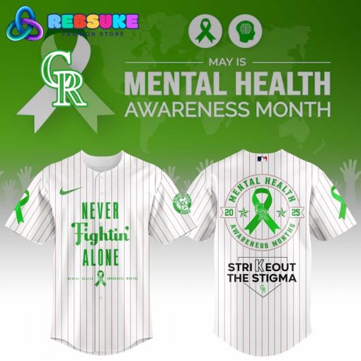 The Colorado Rockies MLB x Mental Health Awareness Month Jersey 2025 features a classic white base with red pinstripes, honoring the Rockies tradition while incorporating Mental Health Awareness Month themes. The front displays the Colorado Rockies “CR” logo in green, the color of mental health awareness, accented by green ribbons that symbolize support and resilience. The phrase “Never Fightin’ Alone” is boldly printed in green, delivering an uplifting message to those facing mental health challenges.