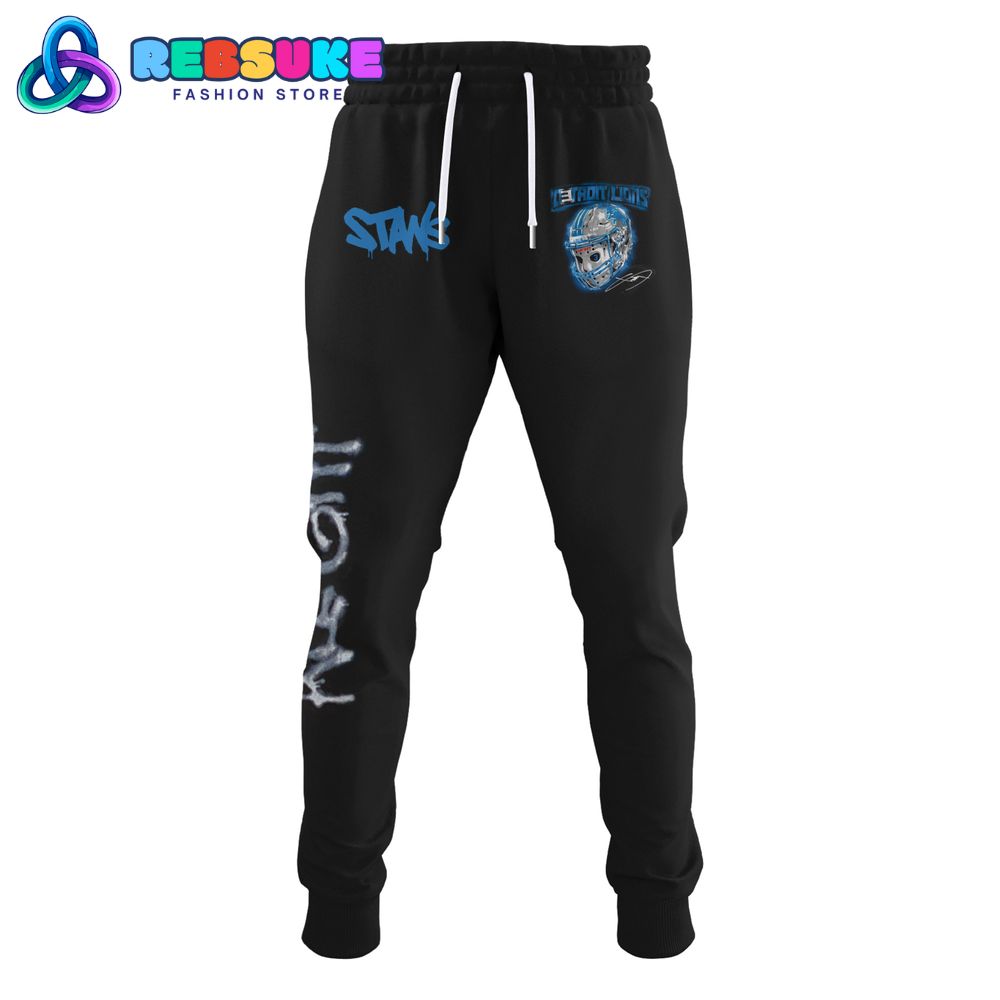 The accompanying joggers from the Detroit Lions x Eminem “STANS” The Official Soundtrack Hoodie Set complete the look with equally bold, thematic graphics. The joggers feature stylized blue and white text on the legs, including a prominent “STANS” graphic, tying the set directly back to the theme of dedicated fandom. Additionally, one leg includes the striking Lions helmet graphic seen on the back of the hoodie with the “DETROIT LIONS” text above it. The black base of the joggers creates a consistent, sleek silhouette with the hoodie, making this Eminem-inspired set the ultimate way to represent the Detroit Lions with street-smart style.