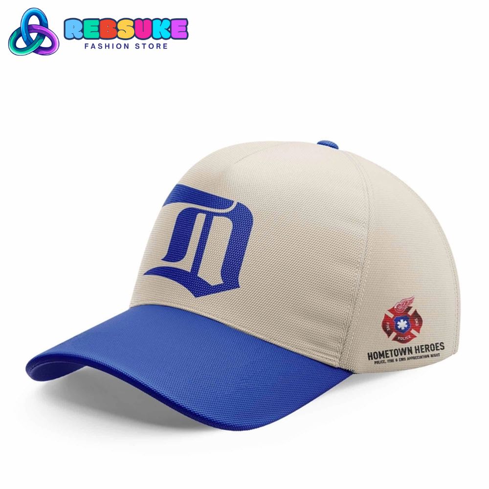 This hoodie set is completed by a matching hat that echoes the design of the hoodie. The hat is likely a classic baseball cap style, with a blue brim and a cream-colored crown. The front of the hat features the same prominent Detroit Red Wings “D” logo, ensuring a cohesive and coordinated look. The overall design of both the hoodie and the hat is a perfect blend of team pride and a heartfelt tribute to the city’s dedicated first responders. Every element, from the bold colors to the meaningful graphics, has been thoughtfully crafted to create a set that is both stylish and full of significance, making the Detroit Red Wings Hometown Heroes Night Blue Hoodie Set a perfect way to celebrate a special night at the arena.