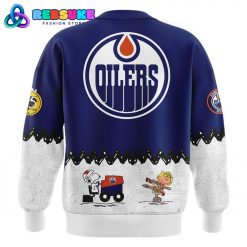 The back of the Edmonton Oilers Peanuts Night Special Sweatshirt 2025 features a large, central display of the team’s primary, circular Oilers logo, ensuring team loyalty is boldly and clearly visible. The overall composition is a perfect balance between serious team pride and lighthearted pop culture collaboration. The use of the Oilers‘ royal blue, orange, and white palette, combined with the classic black-and-white of the Peanuts illustrations in the graphic trim, creates a visually stunning and unique piece of limited edition apparel. Every detail of this sweatshirt makes it a must-have item for celebrating the Edmonton Oilers in 2025.