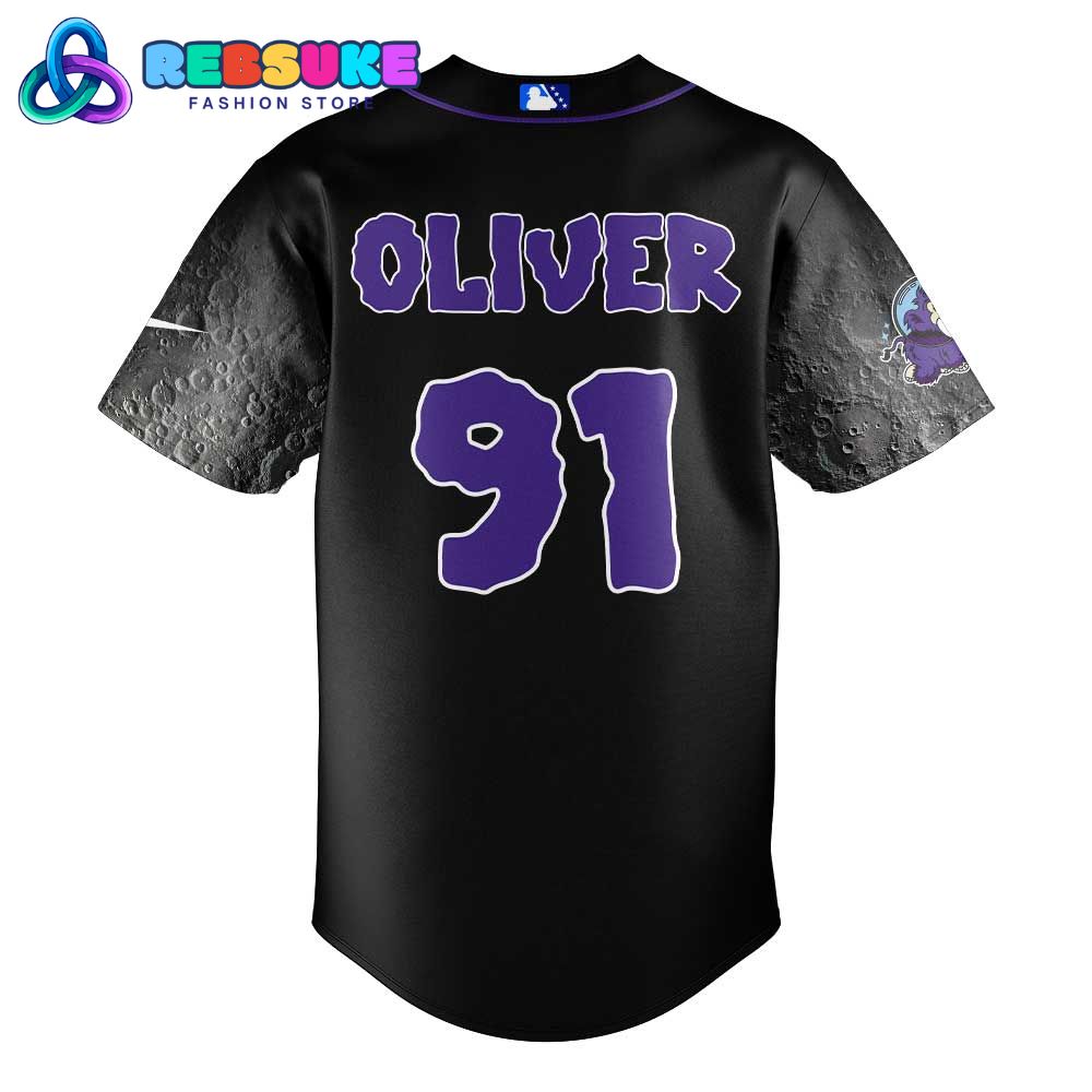 Delving deeper into the intricate details, the sleeves of this Erie Moon Mammoths John Oliver Limited Edition Baseball Jersey feature a subtle yet distinct textured pattern, reminiscent of the lunar surface or the rough hide of a mammoth, adding a unique tactile and visual dimension. The classic white piping along the placket provides a clean contrast against the black, enhancing the traditional baseball jersey aesthetic. On the back, the name “OLIVER” is boldly displayed across the shoulders in a vibrant purple font, perfectly matching the large, prominent number “91” below it. This distinct color choice for the name and number, also seen on the “MOON MAMMOTHS” text on the front, creates a cohesive and eye-catching palette that truly stands out and reinforces the team’s playful spirit.