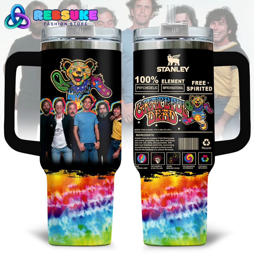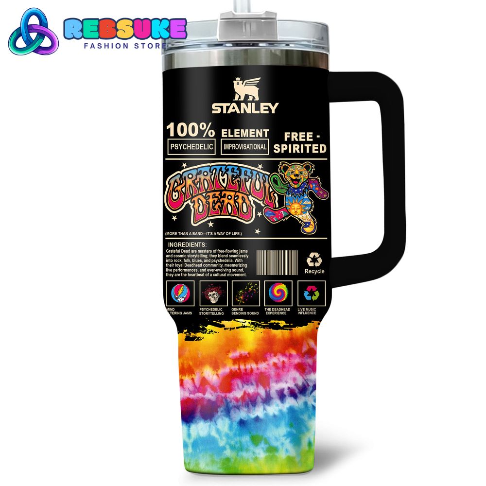 The right side of the tumbler is styled like a product label, blending humor and fandom to celebrate the Grateful Dead’s unique legacy. The label reads “Stanley 100% Element Free-Spirited Psychedelic Improvisational,” branding the Grateful Dead as the ultimate pioneers of their genre. Below, the text “Grateful Dead (More Than A Band—It’s A Way Of Life!)” is prominently displayed, emphasizing the band’s deep connection with their fanbase and their cultural impact. The label also lists playful “ingredients” that define the Grateful Dead’s music—such as “Mind-Bending Jams,” “Psychedelic Storytelling,” “Genre-Bending Sound,” “The Deadhead Experience,” and “Live Music Influence”—each accompanied by small icons like a guitar, a spiral, and a peace sign, adding a thematic flair to the design.