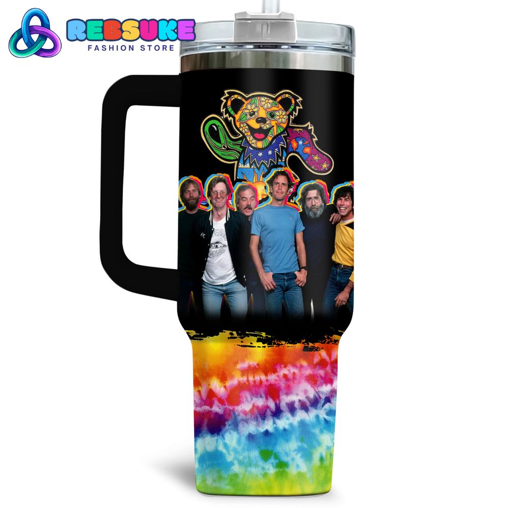 The Grateful Dead Band Free-Spirited Stanley Tumbler features a vibrant and eclectic design that perfectly captures the psychedelic spirit of the Grateful Dead. The tumbler is wrapped in a bold black base color, contrasted by a tie-dye pattern at the bottom in shades of blue, yellow, pink, and green, reflecting the band’s association with the 1960s counterculture movement. On the left side, a central graphic showcases the band members standing together, dressed in casual attire that embodies their laid-back, free-spirited vibe. Above them, the iconic Grateful Dead dancing bear—a beloved symbol of the band—is depicted in bright, multicolored hues, surrounded by stars and flowers, adding a playful and whimsical touch to the design.