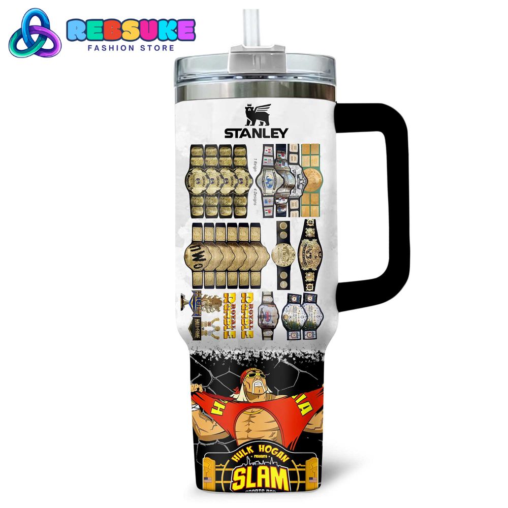 The opposite side of the tumbler serves as a veritable trophy case, chronicling the championship-laden career of Hulk Hogan. It proudly displays a detailed collage of his most famous championship belts, including the revered Winged Eagle WWE Championship and the iconic WCW Big Gold Belt, among others. This visual résumé of his achievements is complemented by other action-packed graphics, such as his signature shirt-rip pose and the “HULK HOGAN SLAM” logo. For any dedicated follower, this tribute tumbler is more than a drinking vessel; it’s a portable museum celebrating the unparalleled success and lasting legacy of a true wrestling legend.