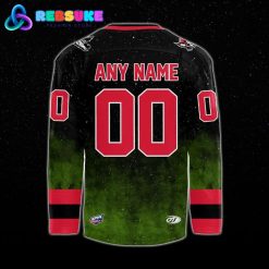 The back of the Huntsville Havoc x Looney Tunes Hockey Jersey 2025 is designed for a personalized and authentic feel. At the top, you can customize the jersey with your own name in bold red lettering. Below the name, your chosen number is displayed in large, prominent red numerals with a white outline, giving it the look of an official game-worn jersey. The background of the jersey continues the dark, mysterious feel of a night sky, a fitting backdrop for Marvin the Martian. This personalization option makes this Huntsville Havoc jersey a truly unique piece of fan apparel, allowing you to feel like a part of the team’s special theme night.