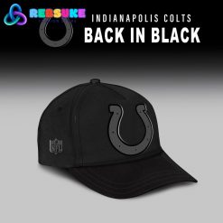 The coordination is flawlessly completed by the accompanying joggers and baseball cap, which finalize the Indianapolis Colts Back In Black Limited Edition Hoodie Set. The joggers maintain the sleek, unified look, featuring a small, dark Colts horseshoe logo and an NFL shield near the pocket, utilizing the exact same muted color palette as the hoodie and offering a comfortable, athletic fit. Similarly, the Indianapolis Colts cap showcases the iconic Colts horseshoe logo embroidered on the front, also executed in a cohesive black-on-black color scheme, expertly tying the entire Limited Edition ensemble together. The deliberate and consistent use of the dark, subdued palette alongside the powerful Indianapolis Colts branding ensures this 2025 Back In Black Hoodie Set is recognized as high-quality, exclusive fan gear for the most discerning supporters of the team.