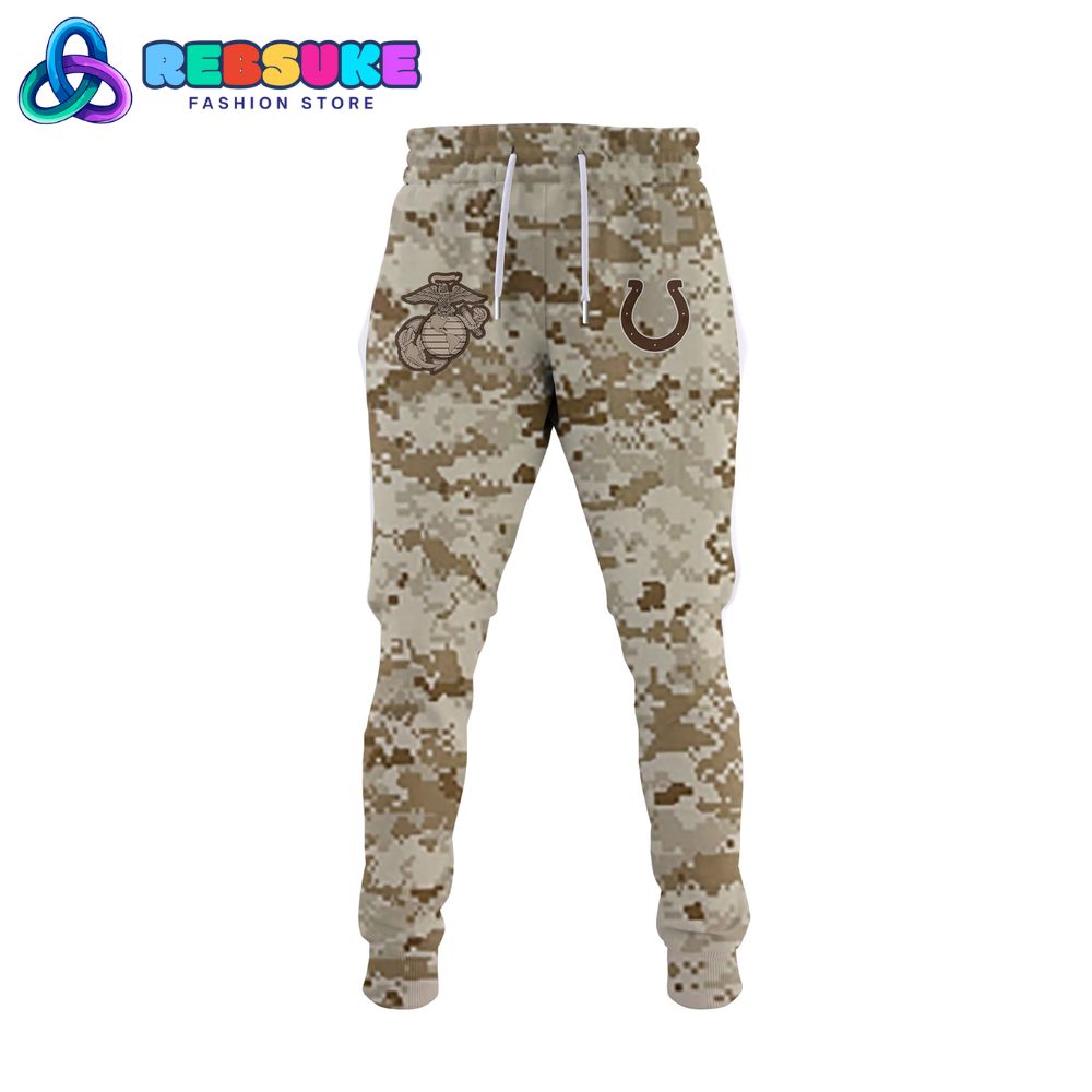 The design of the Indianapolis Colts x US Marine Corps 250th Birthday Hoodie Set is a masterful blend of iconic symbols and a striking camouflage pattern. The hoodie’s front prominently features the Indianapolis Colts logo on one side and a customizable “YOUR NAME” space on the other, allowing for a personal touch. The sleeves and the pocket are adorned with a digital desert camouflage pattern, a nod to the military aesthetic. The NFL shield logo is also present, affirming its official connection to the National Football League. This thoughtful layout ensures that both the team identity and the military tribute are given equal prominence, creating a balanced and visually appealing piece of fan apparel.