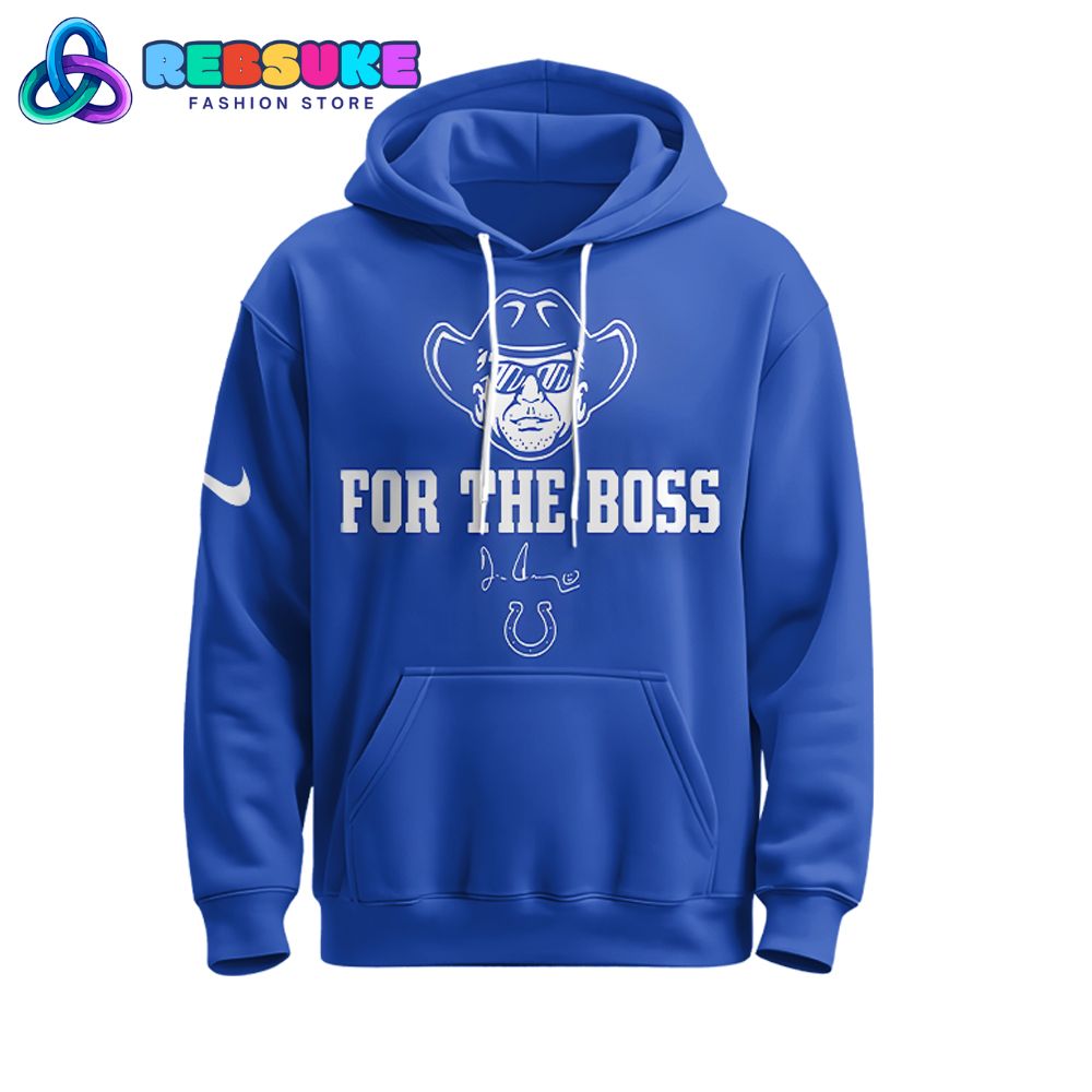 The front of the Indianapolis Colts x Won For Jim Tribute Edition Limited Hoodie features a striking graphic that serves as a powerful centerpiece. At the top, a stylized cartoon portrait of Jim Irsay is depicted wearing a classic cowboy hat and sunglasses, a nod to his distinctive style and personality. Below this portrait, the bold text “FOR THE BOSS” is printed in white, block letters, a fitting nickname that many used to describe the Colts owner. Underneath the text, a unique, artistic depiction of a signature is visible, with the iconic Colts horseshoe logo at the very bottom. This design on the hoodie is a perfect blend of a respectful tribute and a modern, graphic tee aesthetic.