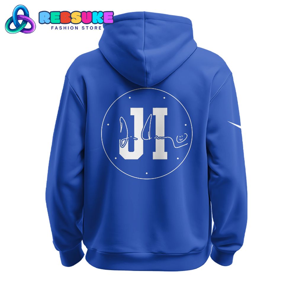 The back of the Indianapolis Colts x Won For Jim Tribute Edition Limited Hoodie offers a clean and iconic design that complements the front. A large circle, bordered with the same texture as the front graphic, contains a bold “JI,” a direct reference to Jim Irsay’s initials. To the right of the initials, a stylized, artistic signature of “J.I.” is included, creating a personal and authentic touch. This powerful and simple design on the back ensures that the message of the tribute edition hoodie is clear from every angle. The design perfectly balances the elaborate front with a minimalist, yet meaningful, back that all Colts fans will recognize and appreciate.
