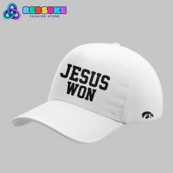 The cap included in the Iowa Hawkeyes Football “Jesus Won” set completes the cohesive look. The front of the crisp white cap features the same bold, black “JESUS WON” slogan, ensuring the message is visible from every angle. The side of the cap proudly displays the classic Iowa Hawkeyes logo, a detail that perfectly ties the entire outfit together. This three-piece set—the hoodie, joggers, and cap—is a complete expression of both sports fandom and personal faith. The deliberate placement of each element creates a unified design that is both stylish and meaningful, making this Iowa Hawkeyes collection a truly special piece of apparel.
