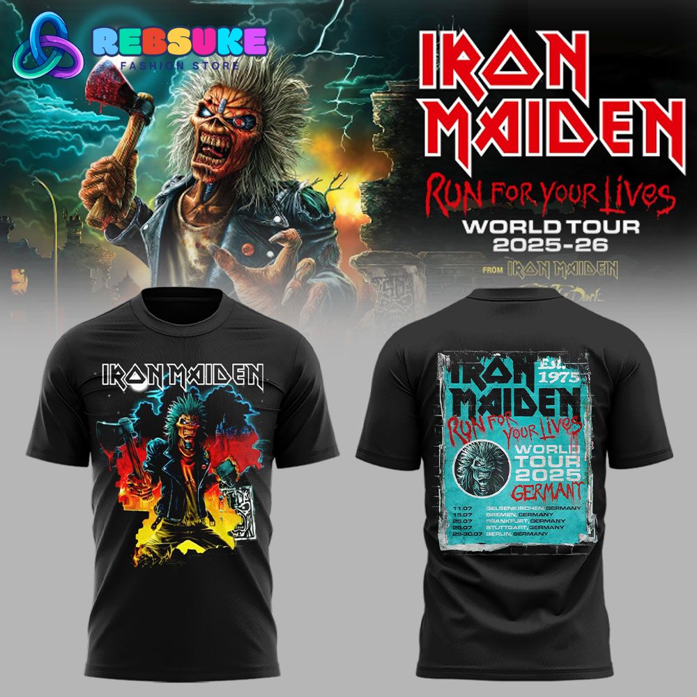 The back of the shirt is masterfully designed to resemble a vintage, battle-worn tour flyer, taped up as a treasured keepsake. It prominently displays the “Run For Your Lives” tour title and explicitly states its focus: “WORLD TOUR 2025 GERMANY”. Below this declaration is the crucial list of the five German cities and their specific dates in July and August 2025, serving as a permanent record of this incredible leg of the tour. This authentic, gritty design transforms the shirt into a historical document, a personal roadmap of the nights Iron Maiden laid siege to Germany.