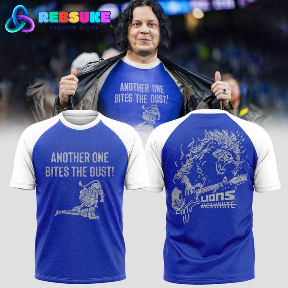 Crucially, the bottom of the back graphic grounds the shirt in its official context. Below the roaring, guitar-wielding lion, the word “LIONS” is prominently displayed, immediately followed by “JACK WHITE” in a distinct typeface, confirming the official nature of this legendary crossover. The consistent use of monochromatic art (white or silver on the blue shirt) ensures that the design feels unified and focused, placing all emphasis on the fusion of the rock and sports identities. The seamless blend of the lyric, the Lions‘ iconography, and the unmistakable Jack White musical motif makes this “Another One Bites The Dust” Shirt a definitive, must-have commemorative item.