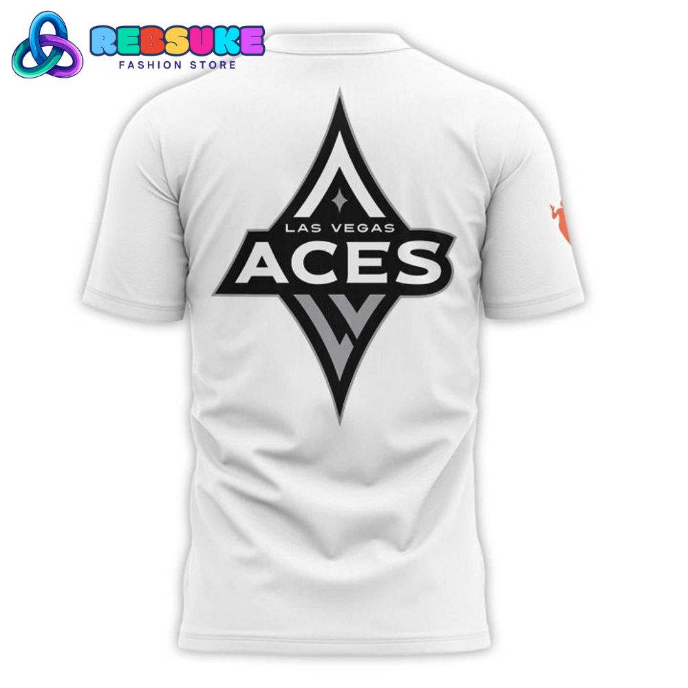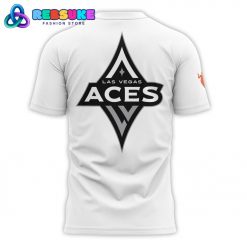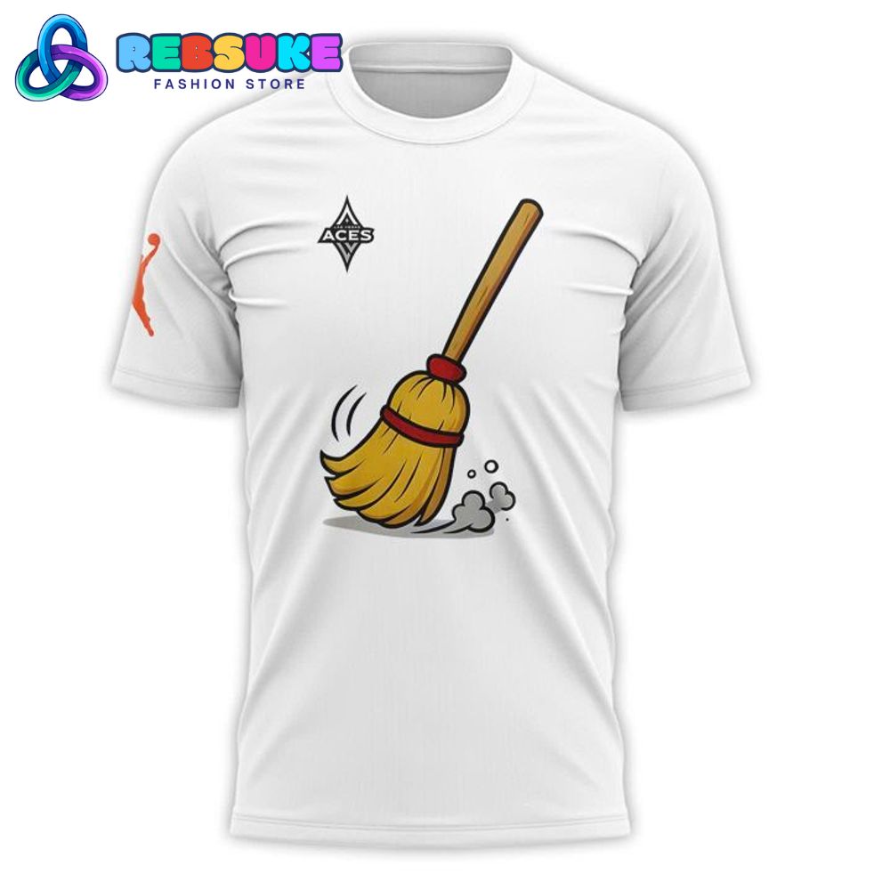 The back of the shirt features the official Las Vegas Aces logo, presented in a bold, eye-catching black and white motif. This classic Aces branding—a sleek, pointed spade shape with the words “LAS VEGAS ACES”—symbolizes the team’s high-stakes, winning spirit. A smaller team logo is also subtly placed on the upper chest or sleeve, ensuring the Aces brand is visible from all angles. The pairing of the playful broom and the powerful, official Aces crest creates a memorable contrast, perfectly capturing the fun and dominance of the 2025 WNBA Championship.