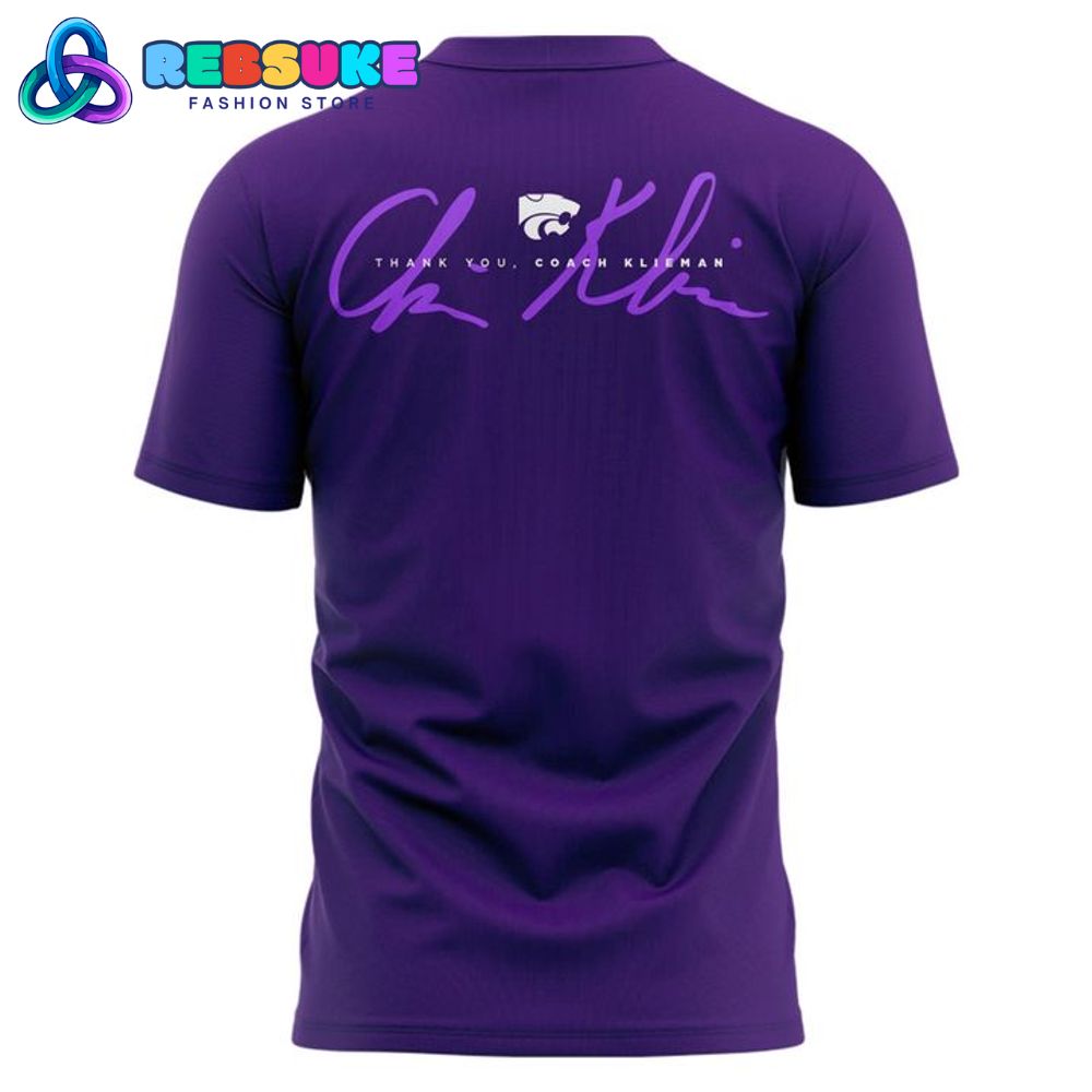 The reverse side of the Kansas State Wildcats Football Thank You Coach Klieman Shirt reinforces the personal nature of the tribute. The back features a large, stylized graphic of what appears to be Coach Klieman’s signature, dramatically displayed across the shoulders in a dark purple or black tone. Beneath the signature, the printed message “THANK YOU, COACH KLIEMAN” is repeated in a clean, legible font, completing the dual expression of appreciation. This prominent back graphic ensures the shirt is instantly recognizable as a tribute item dedicated to the former Kansas State head coach.