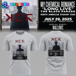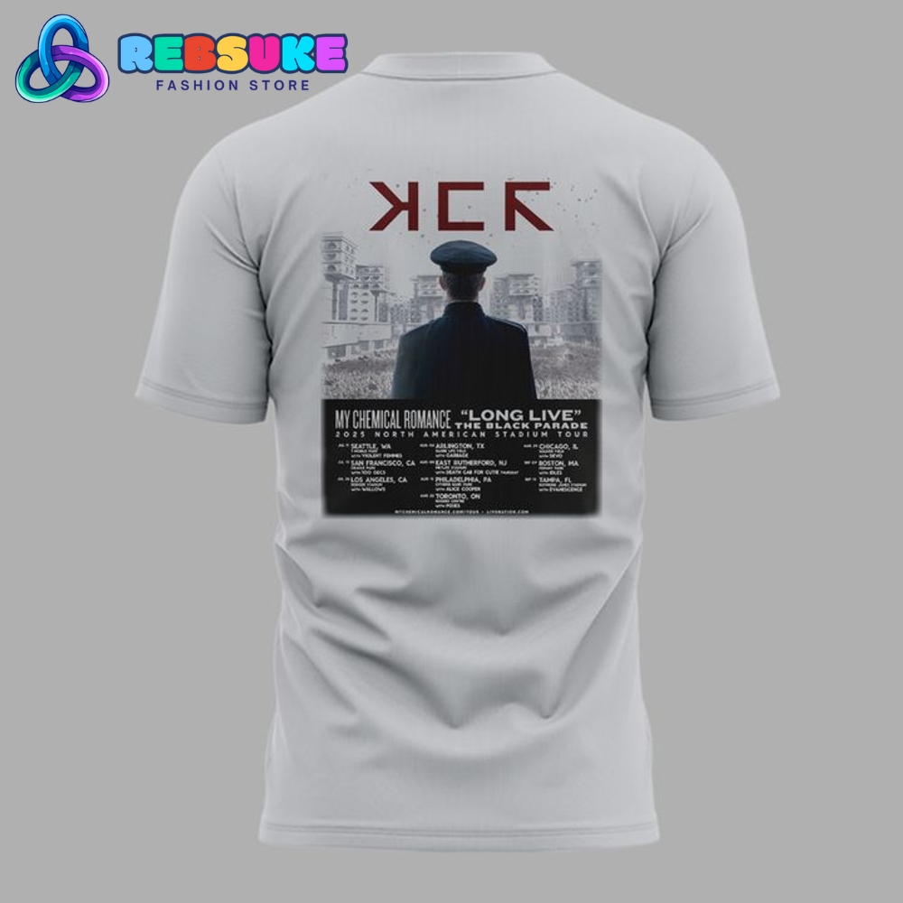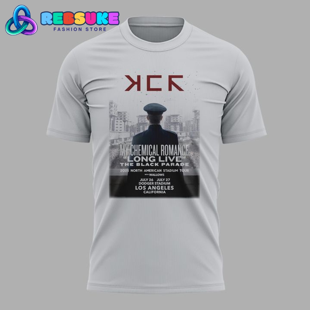 The front of the LA Dodgers x MCR Long Live The Black Parade Tour Shirt 2025 immediately captures attention with its blend of band iconography and tour details. The shirt is presented in a light gray or off-white, providing a versatile and modern base. Across the chest, a prominent “MCR” logo is boldly displayed, signifying the band’s presence. Below this, a compelling graphic features the back of a figure in a black coat and hat, an iconic visual from “The Black Parade” era, setting the thematic tone. Further down, a detailed “MY CHEMICAL ROMANCE ‘LONG LIVE’ THE BLACK PARADE NORTH AMERICAN STADIUM TOUR” concert poster graphic, including dates and venues like Los Angeles and Dodger Stadium, is featured, clearly documenting the specific event this shirt commemorates. This impactful front design sets the LA Dodgers x MCR Long Live The Black Parade Tour Shirt apart as a truly special item.