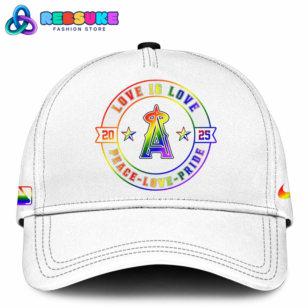 The back of the Los Angeles Angels MLB x Happy Pride Month Jersey 2025 features a circular graphic with “LOVE IS LOVE” in rainbow hues encircling the Los Angeles Angels logo. The words “PEACE • LOVE • PRIDE” surround the design, with “20” and “25” marking the year on either side. A distressed rainbow American flag with scattered stars adorns the lower back, adding a patriotic yet inclusive touch. This detailed artwork makes the jersey a powerful tribute to both Pride Month 2025 and Los Angeles Angels fans.