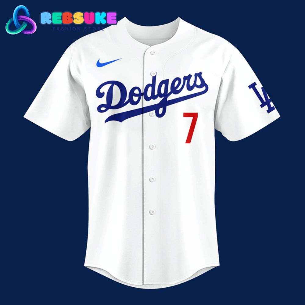 The front of the Los Angeles Dodgers x Son Heung-Min New 2025 Baseball Jersey features the classic, iconic “Dodgers” script across the chest in the team’s signature blue, a timeless symbol of baseball excellence. Below this, the number “7” is boldly displayed in a striking red, a direct tribute to Son Heung-Min‘s legendary jersey number for both club and country. This powerful combination seamlessly merges the two brands, creating a harmonious and aesthetically pleasing design. The official Nike Swoosh is elegantly placed on the chest, signifying the jersey’s authenticity and high-quality construction. This simple yet effective design ensures that the new 2025 jersey maintains a clean, classic look while incorporating a unique and meaningful detail that sets it apart.