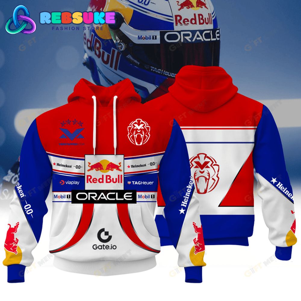 Attention to detail is evident in the Max Verstappen 2025 Red Bull Racing New Hoodie, Cap design, with sponsor logos like Oracle, TAG Heuer, and Heineken meticulously placed to replicate the authenticity of Verstappen’s racing gear. The hoodie’s sleeves feature dynamic stripes and star accents, adding a sporty edge, while the back showcases a large lion graphic paired with Verstappen’s initials, MV, in a sleek design. The cap, with its curved bill, mirrors the hoodie’s color palette and includes the Red Bull Racing branding, making this Max Verstappen 2025 Red Bull Racing New Hoodie, Cap set a cohesive and stylish ensemble.