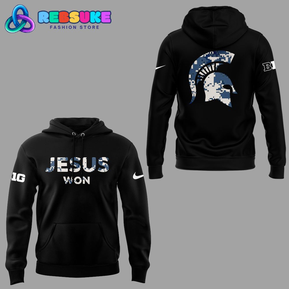 The black hoodie serves as the centerpiece of the collection, featuring the bold declaration “JESUS WON” across the chest. The letters are filled with a striking blue and white digital camouflage pattern, creating a modern aesthetic that speaks to strength and purpose. The back of the hoodie makes an equally powerful statement with a large, iconic Spartan helmet, also filled with the same digital camo, representing the unyielding spirit of the Michigan State Spartans. The sleeves are adorned with the B1G conference logo and the Nike swoosh, signifying authentic, high-quality athletic apparel.