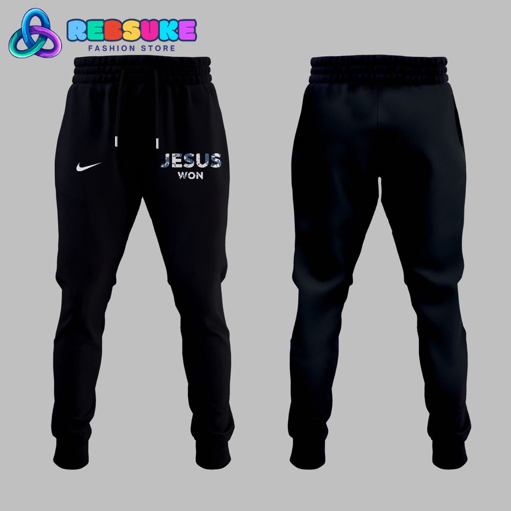 The comfortable black jogger-style sweatpants are designed to create a seamless, powerful look with the hoodie. They feature the same “JESUS WON” message prominently on the upper left thigh, with the text filled with the matching digital camo pattern. The opposite leg is accented with the classic white Nike swoosh. Engineered with a secure drawstring waist and modern cuffed ankles for a perfect fit, these joggers are ideal for workouts, casual wear, or proudly displaying your faith and team spirit on the go. They are an essential part of this inspiring 2025 Limited Edition Hoodie Set.