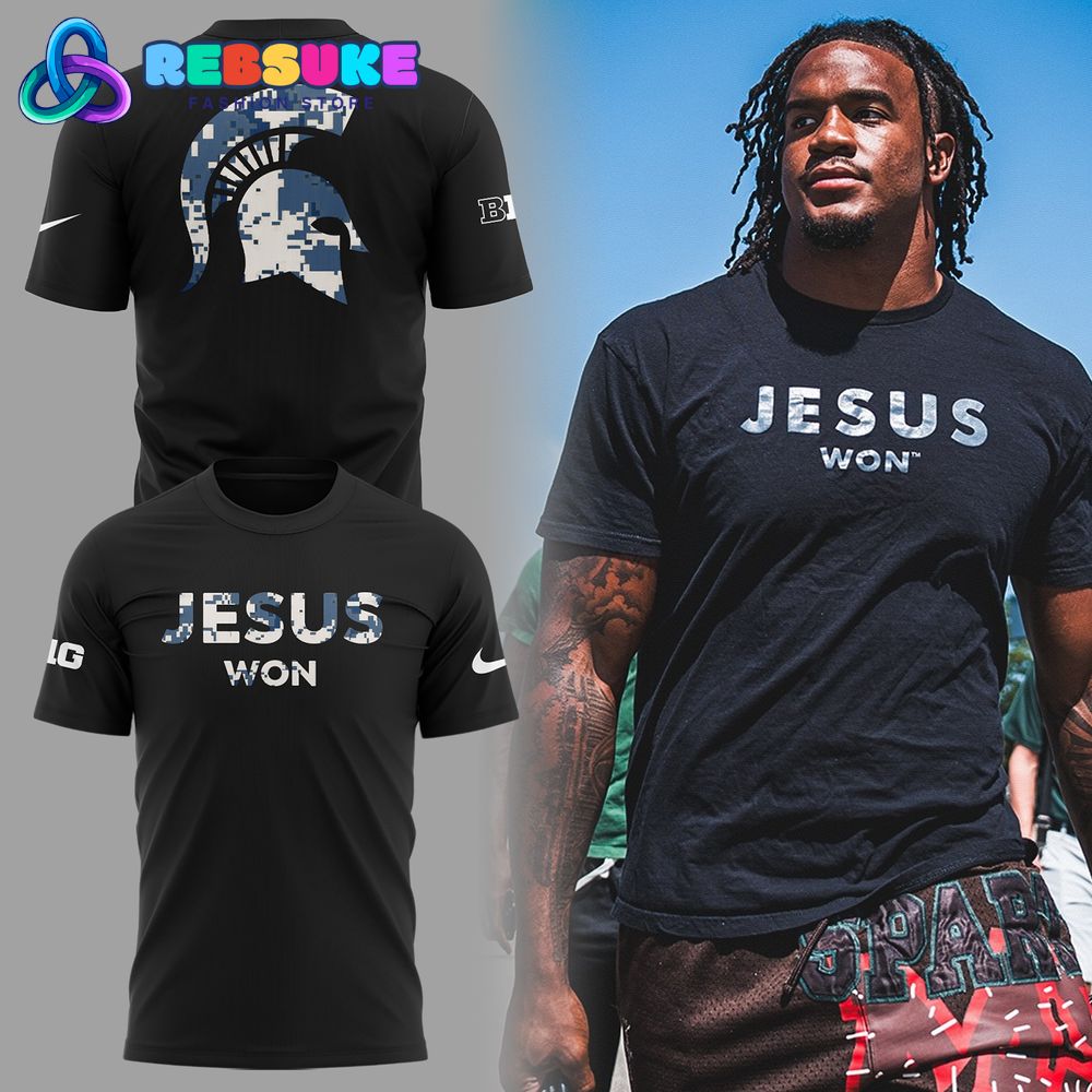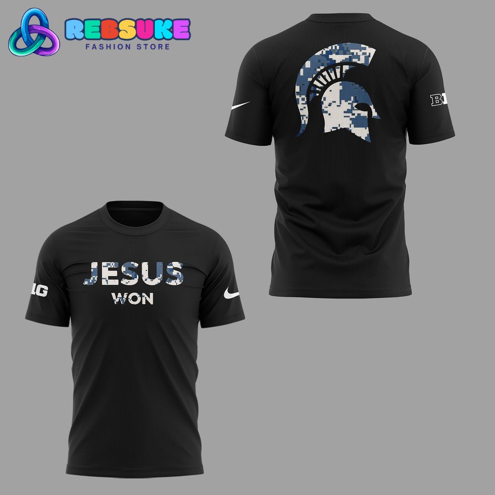 The front of the Michigan Spartans x Jesus Won 2025 Limited Edition Shirt features a clean, impactful design on a classic black base. The powerful words “JESUS WON” are emblazoned across the chest, with the word “JESUS” filled with a striking blue-toned digital camouflage pattern, adding modern texture and visual interest. This design is complemented by instantly recognizable athletic branding, including the Big Ten (B1G) Conference logo on the sleeve and a classic swoosh on the chest, giving this Jesus Won shirt an authentic, performance-ready appearance that any sports fan will respect.