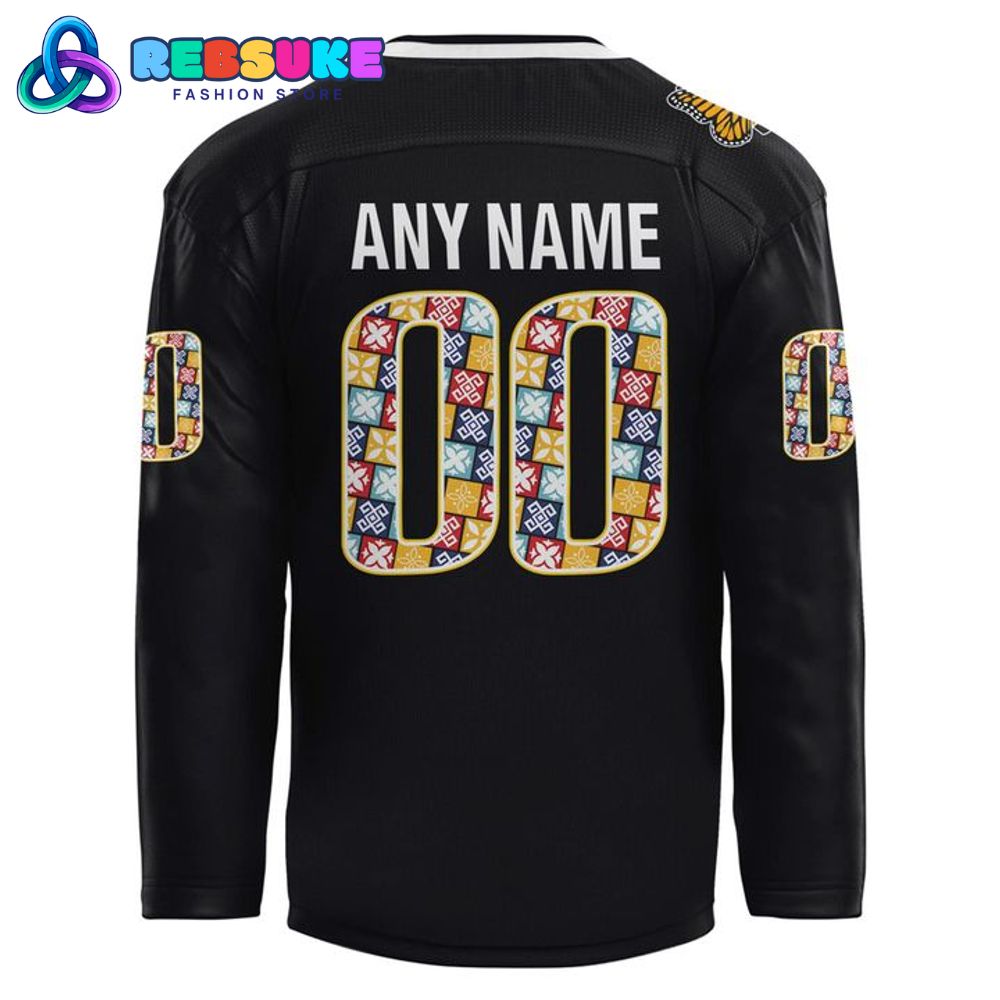 A closer look reveals the jersey’s most compelling cultural feature: the decorative pattern woven into the numerals. The large “00” on the back, customizable with ANY NAME above it, is filled with a repeating pattern inspired by vibrant Talavera tiles or a richly colored Serape blanket. This intricate pattern, bursting with reds, yellows, and blues against the dark background, beautifully celebrates the complexity and richness of Latin American culture and music genres, a deliberate artistic choice to promote connection and togetherness. This unique detailing transforms a simple number into a focal point of cultural celebration on this customized hockey jersey.