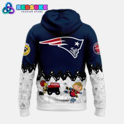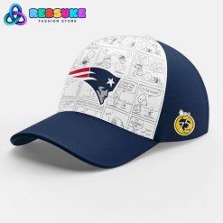 The accompanying New England Patriots x Peanuts Night Special Cap perfectly complements the hoodie with a design that heavily features the comic strip’s elements. The cap’s crown is primarily white, covered in black-and-white comic panel artwork featuring the Peanuts gang, and is contrasted by a navy blue visor. The front of the cap proudly displays the classic New England Patriots logo, reinforcing the team connection. The back of the hoodie carries a large New England Patriots flying logo set against the dominant navy blue, ensuring that team pride remains the central focus of the entire Special Hoodie, Cap 2025 collection, creating a cohesive and compelling fan set.