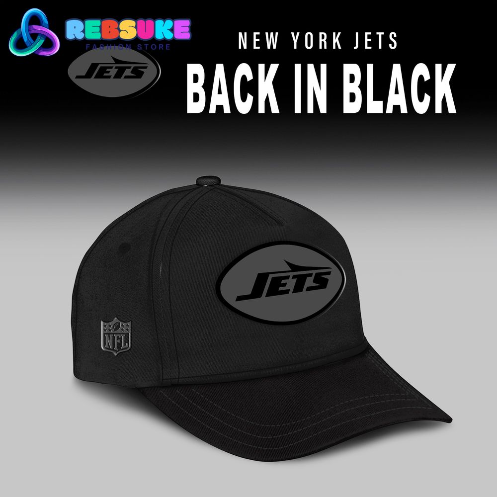 The coordination is flawlessly completed by the accompanying joggers and baseball cap, which finalize the New York Jets Back In Black Limited Edition Hoodie Set. The joggers maintain the sleek, unified look, featuring a small, dark Jets oval logo and an NFL shield near the pocket, utilizing the exact same muted color palette as the hoodie and offering a comfortable, athletic fit. Similarly, the New York Jets cap showcases the iconic Jets oval logo embroidered on the front, also executed in a cohesive black-on-black color scheme, expertly tying the entire Limited Edition ensemble together. The deliberate and consistent use of the dark, subdued palette alongside the powerful New York Jets branding ensures this 2025 Back In Black Hoodie Set is recognized as high-quality, exclusive fan gear for the most discerning supporters of the team.