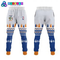 Moving down to the lower half of the New York Knicks 2025 Christmas Grinch Jumper Hoodie Set, the joggers continue the intricate festive motif. The pants feature a tapered fit with ribbed orange cuffs at the ankles to match the hoodie’s trim. Large sections of the legs are adorned with repeating patterns of the NBA logo and “Grinch” text, ensuring that every angle of the Knicks holiday tracksuit is visually engaging. The clever use of orange, blue, and white accents maintains the team’s identity while the whimsical Grinch holiday graphics add a touch of humor and personality that stands out from standard team merchandise.