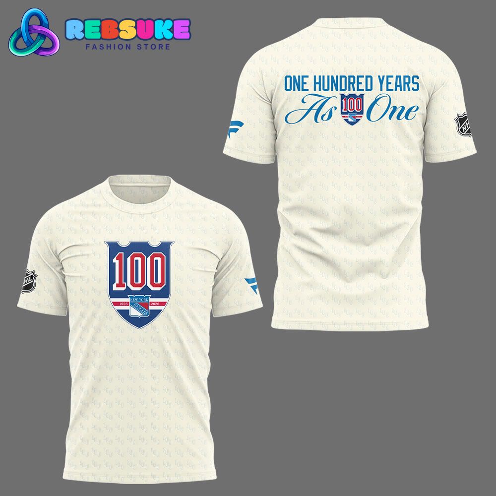 The back of the shirt features an equally powerful and elegant design. The main graphic is the phrase “ONE HUNDRED YEARS AS ONE” written in a stylized font that combines the team’s classic blue with a more modern feel. Below the text, the centennial logo is repeated, reinforcing the shirt’s theme and adding a touch of consistency to the design. This dual-sided approach ensures that the shirt makes a statement from every angle, celebrating the team’s long-standing history and the unity of its fanbase. The back design of the New York Rangers “One Hundred Years As One” Shirt 2025 is what truly makes it a collector’s item, showcasing a deep appreciation for the team’s legacy.