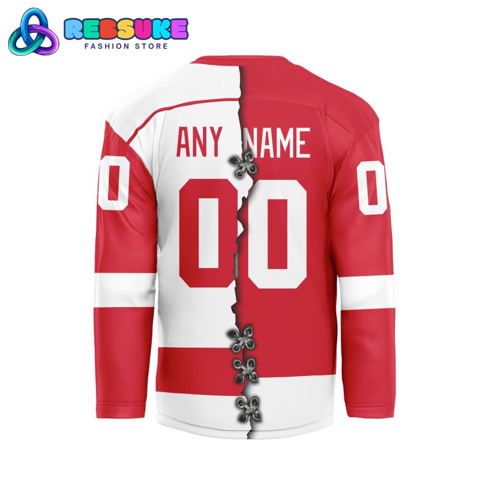 The NHL Detroit Red Wings Limited Home Mix Away Jersey features a bold split design that seamlessly blends the team’s home and away aesthetics into one eye-catching piece. The front of the jersey is divided down the middle, with the left side showcasing the Red Wings’ vibrant red home color and the right side in a crisp white, reflecting their away kit. The team’s logo—the iconic winged wheel—takes center stage, rendered in a striking red and white combination that pops against the contrasting backgrounds.