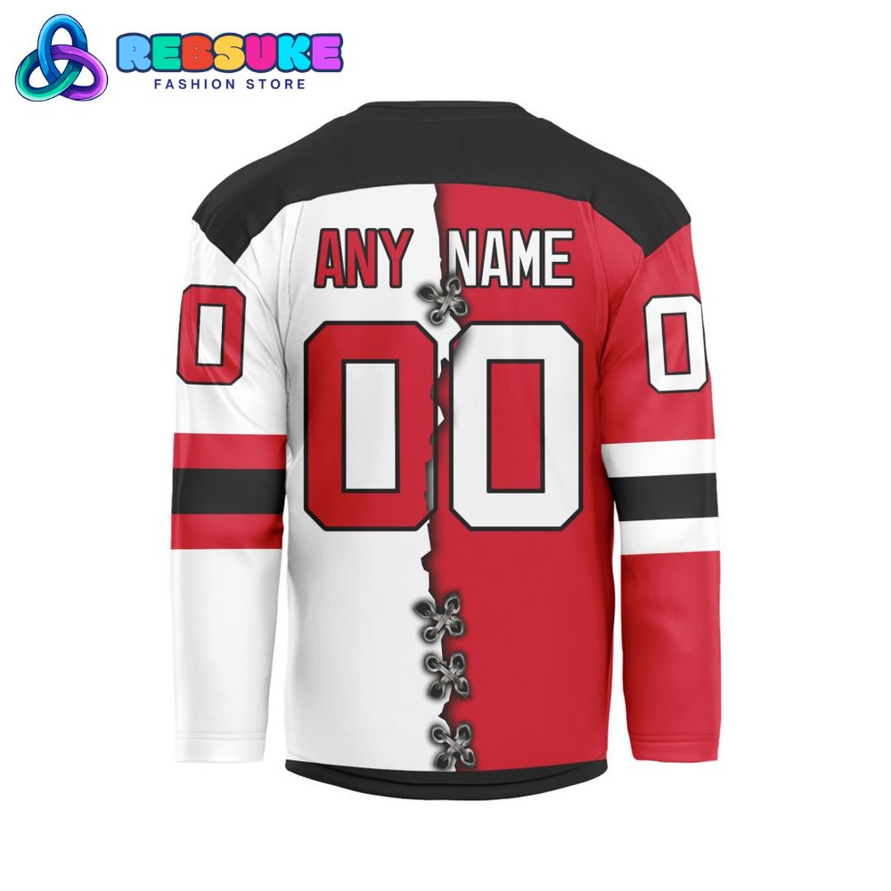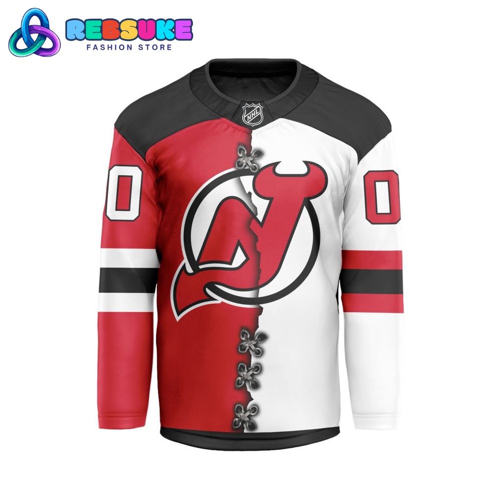 The NHL New Jersey Devils Limited Home Mix Away Jersey features a bold split design that seamlessly blends the team’s home and away aesthetics into one eye-catching piece. The front of the jersey is divided down the middle, with the left side showcasing the Devils’ fiery red home color and the right side in a crisp white, reflecting their away kit. The team’s logo—a striking “NJ” with devil horns and a tail—takes center stage, rendered in a vibrant red and black combination that pops against the contrasting backgrounds.