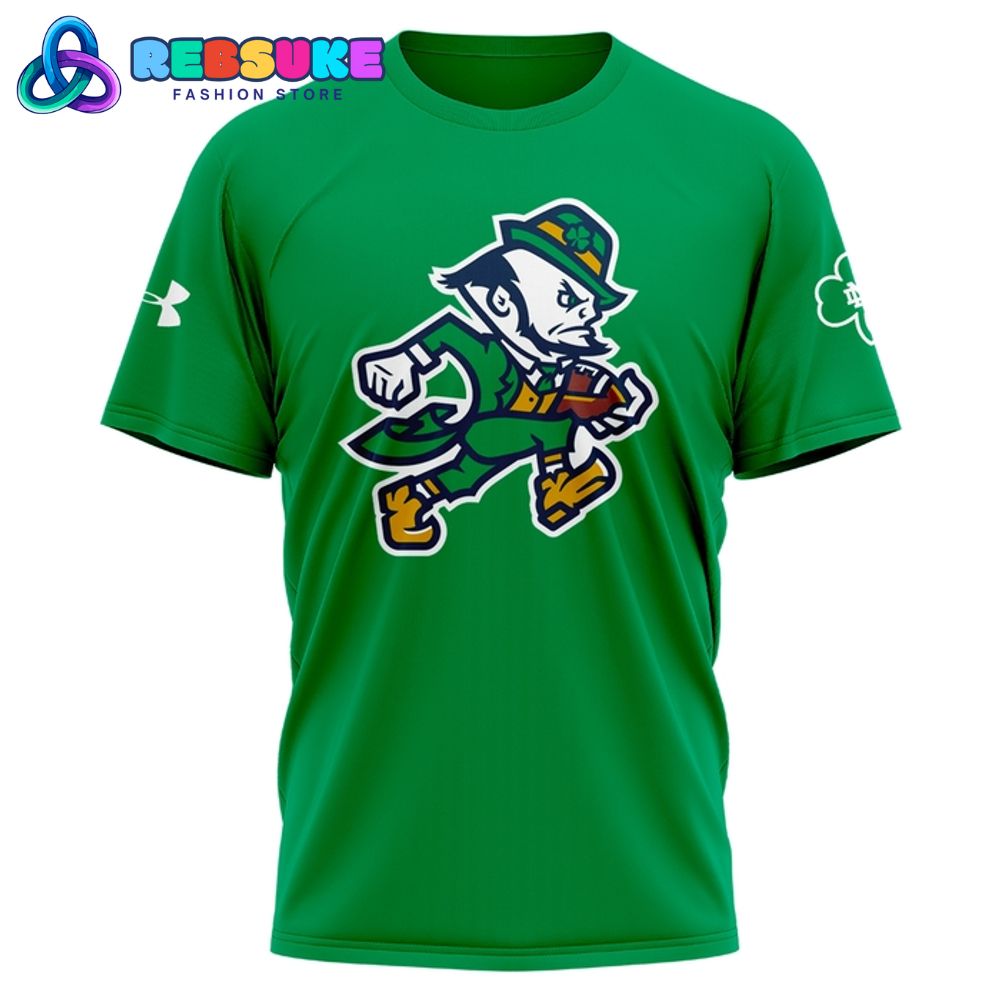The front of the Notre Dame Football “The Fighting Irish” 2025 Special Shirt features a bold and iconic graphic that is instantly recognizable to any fan. The centerpiece of the design is the beloved Notre Dame leprechaun mascot, rendered in a dynamic, action-oriented pose as he runs with a football. The leprechaun’s traditional attire—a green jacket, top hat, and a fierce expression—is captured with impressive detail. This classic and timeless illustration perfectly embodies the spirited and determined nature of the Fighting Irish on the gridiron, making the front of the shirt a powerful and direct statement of team pride.