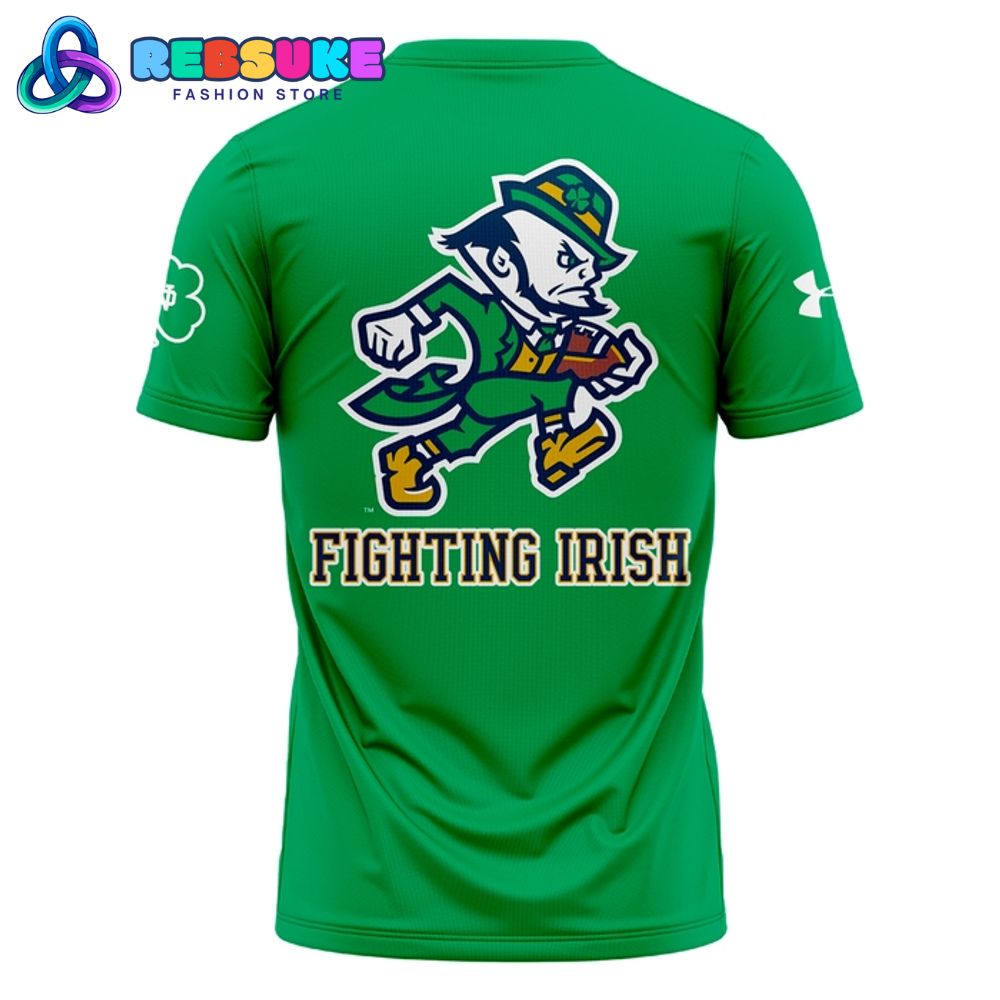 Turning to the back of the special shirt, the design continues the theme with a complementary graphic and text. The same athletic leprechaun mascot from the front is featured again, this time perhaps in a different, equally dynamic pose. Below the mascot, the words “FIGHTING IRISH” are proudly displayed in bold, capital letters. This simple yet effective text reinforces the team’s nickname and rallying cry, ensuring that the message is clear to all. This back design is a perfect complement to the front, creating a cohesive and well-rounded piece of fan apparel that is strong from every angle.