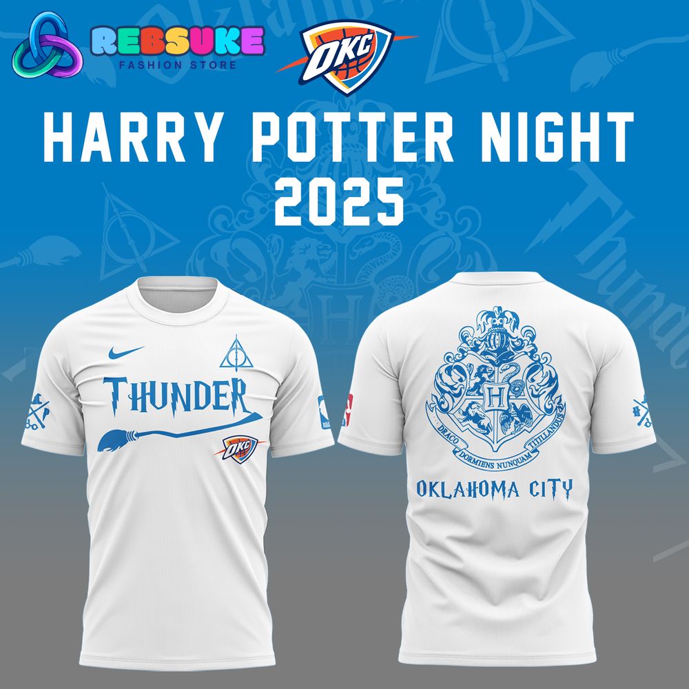 The overall aesthetic of this white shirt is one of sophisticated fun and classic style. It acts as the perfect gallery space for the creative amalgamation of the energetic Oklahoma City Thunder brand and the timeless lore of the Harry Potter universe. The clean look ensures that the focus remains squarely on the clever design elements and the vibrant team colors. This shirt is the ideal choice for the fan who appreciates understated elegance, offering a crisp, stylish, and unforgettable way to commemorate a truly magical night of sports and fantasy.