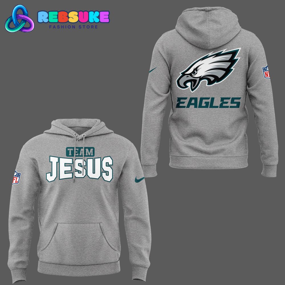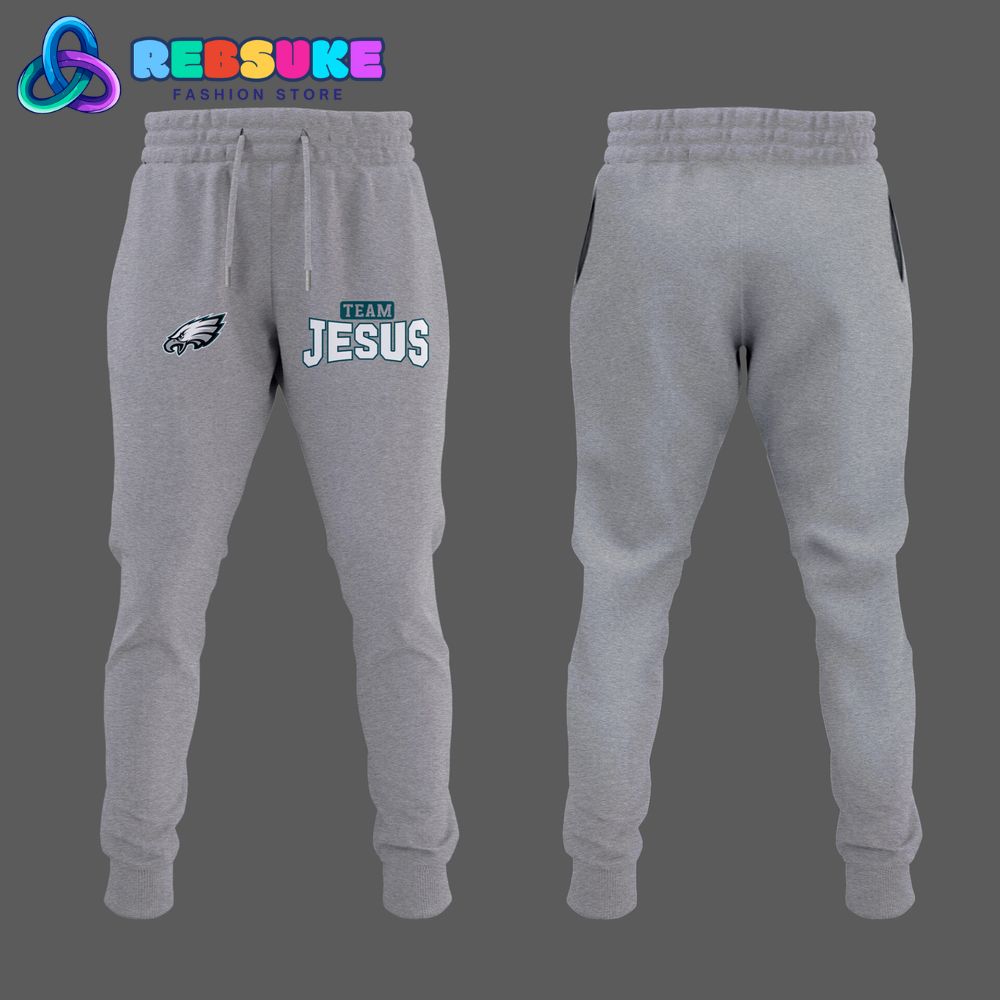 The hoodie in the Philadelphia Eagles x Team Jesus Limited Edition Hoodie Set is a bold and faith-centered design on a neutral gray background. The words “TEAM JESUS” are the focal point, with “TEAM” in a smaller font above the much larger, bolded “JESUS“. The text is rendered in the distinctive green and white colors of the Eagles, creating an immediate and unmistakable connection to the team. An NFL shield logo and the Nike Swoosh are also visible on the front, lending an official, high-quality feel to this unique collaboration. The hoodie features a convenient kangaroo pocket and a comfortable, adjustable hood with drawstrings.