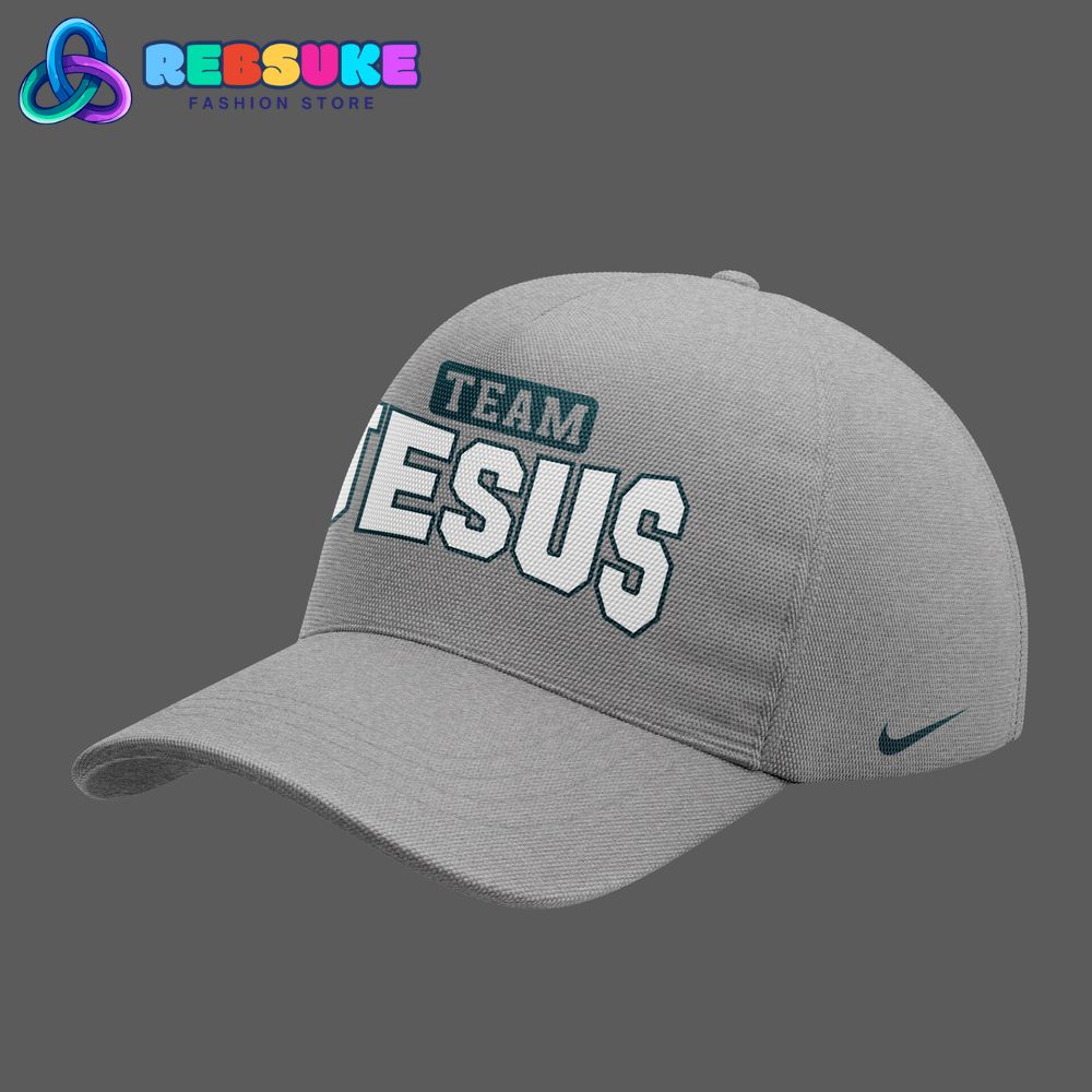 Completing the Philadelphia Eagles x Team Jesus Limited Edition Hoodie Set is the matching cap, which perfectly ties the collection together. The cap is a classic baseball-style hat in the same gray fabric as the hoodie and pants. The front of the cap features the “TEAM JESUS” graphic, with the word “TEAM” in green and “JESUS” in a large, white font with a green outline. The Nike Swoosh is also visible on the side of the cap, providing a final touch of official branding. This complete set, from the hoodie to the pants and the cap, is a perfect way for any fan to wear their faith and their fandom with pride.